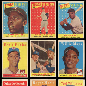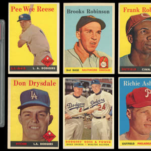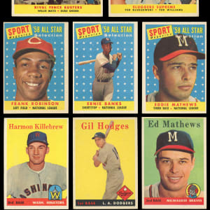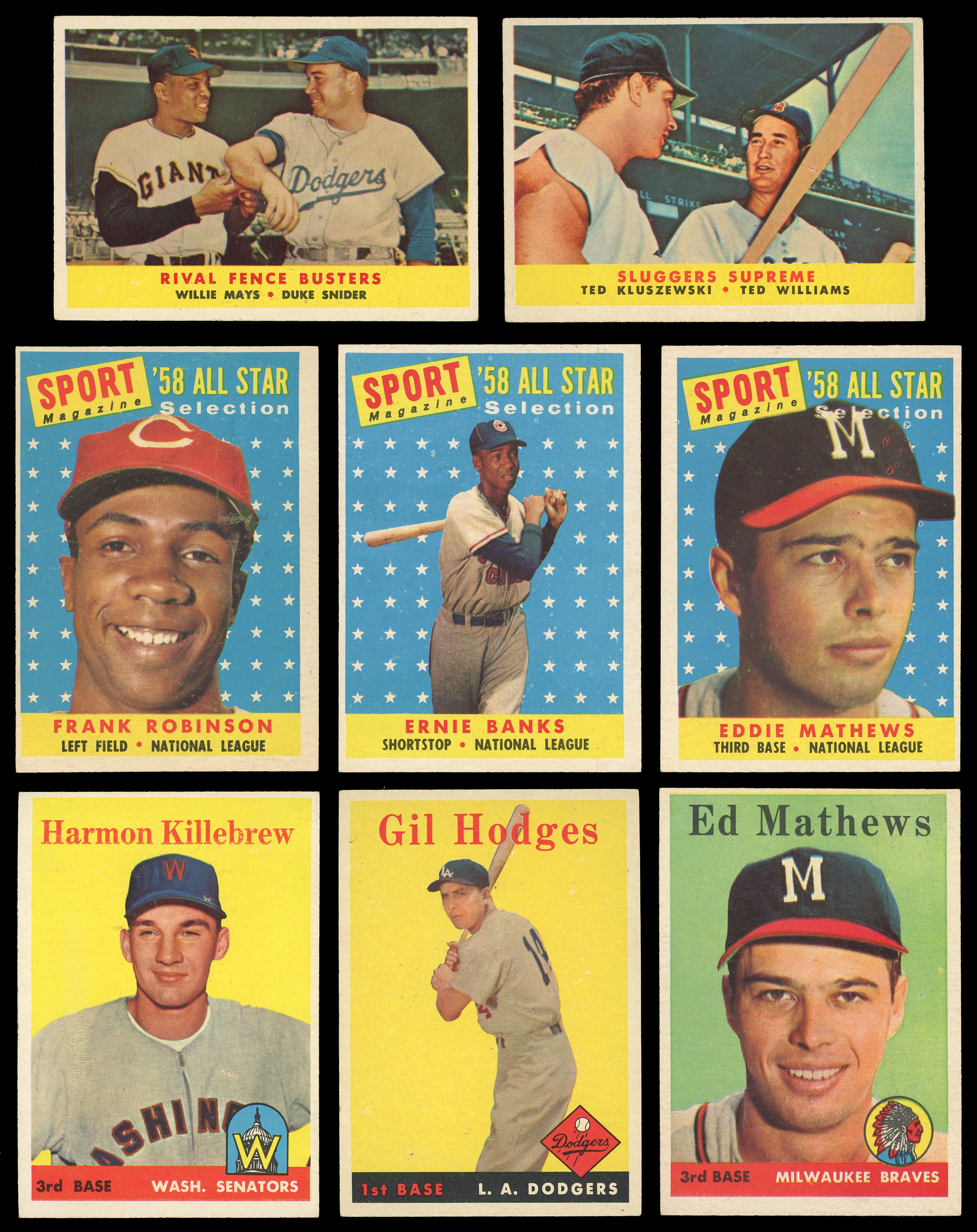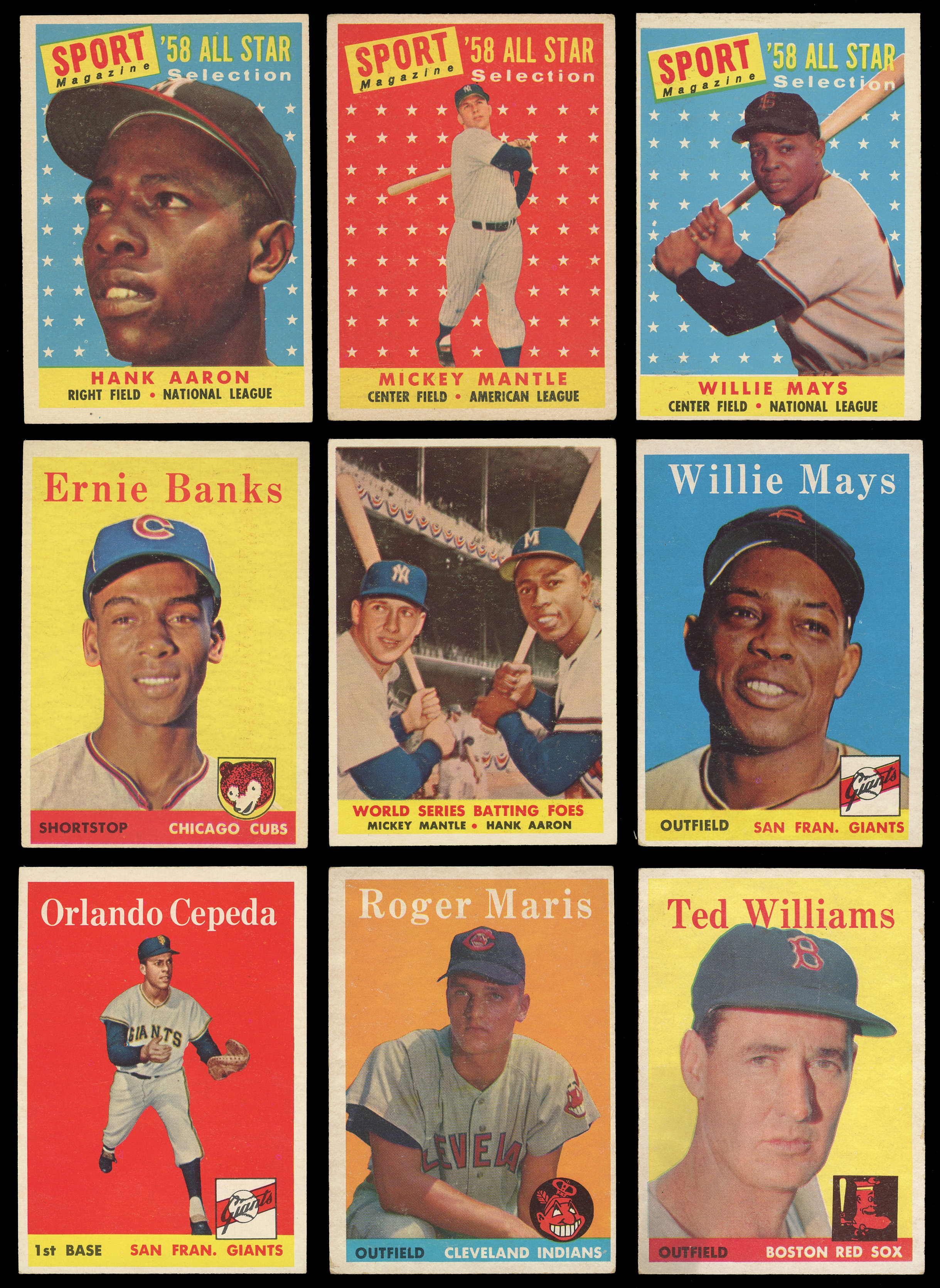 Big League 1958 Topps partial set of (346/494) cards with several Hall of Famers and additional keys. This “collector’s grade” assembly generally presents in the (VG-EX to EX) range with some better or lesser. Keys include: #1 T. Williams (GD, stain), #5 Mays (VG), #25 Drysdale (VG), #47 Maris RC (VG), #162 Hodges (EX), #230 Ashburn (VG-EX), #285 F. Robinson (VG-EX), #288 Killebrew (VG-EX), #307 B. Robinson (EX), #310 Banks (VG-EX), #314 Snider/Alston (VG-EX), #320 Ford (EX), #321 Kluszewski/Williams (EX), #343 Cepeda RC (EX-MT), #368 Colavito (EX), #375 Reese (VG-EX), #418 Mantle/Aaron (VG-EX), #420 Pinson RC (VG-EX), #436 Mays/Snider (EX-MT), #440 Mathews (EX), #464 Flood RC (EX-MT), #476 Musial AS (PSA EX-MT 6), #480 Mathews AS (EX), #482 Banks AS (EX), #484 F. Robinson AS (VG-EX), #486 Mays AS (VG-EX), #487 Mantle AS (VG-EX) and #488 Aaron AS (EX).