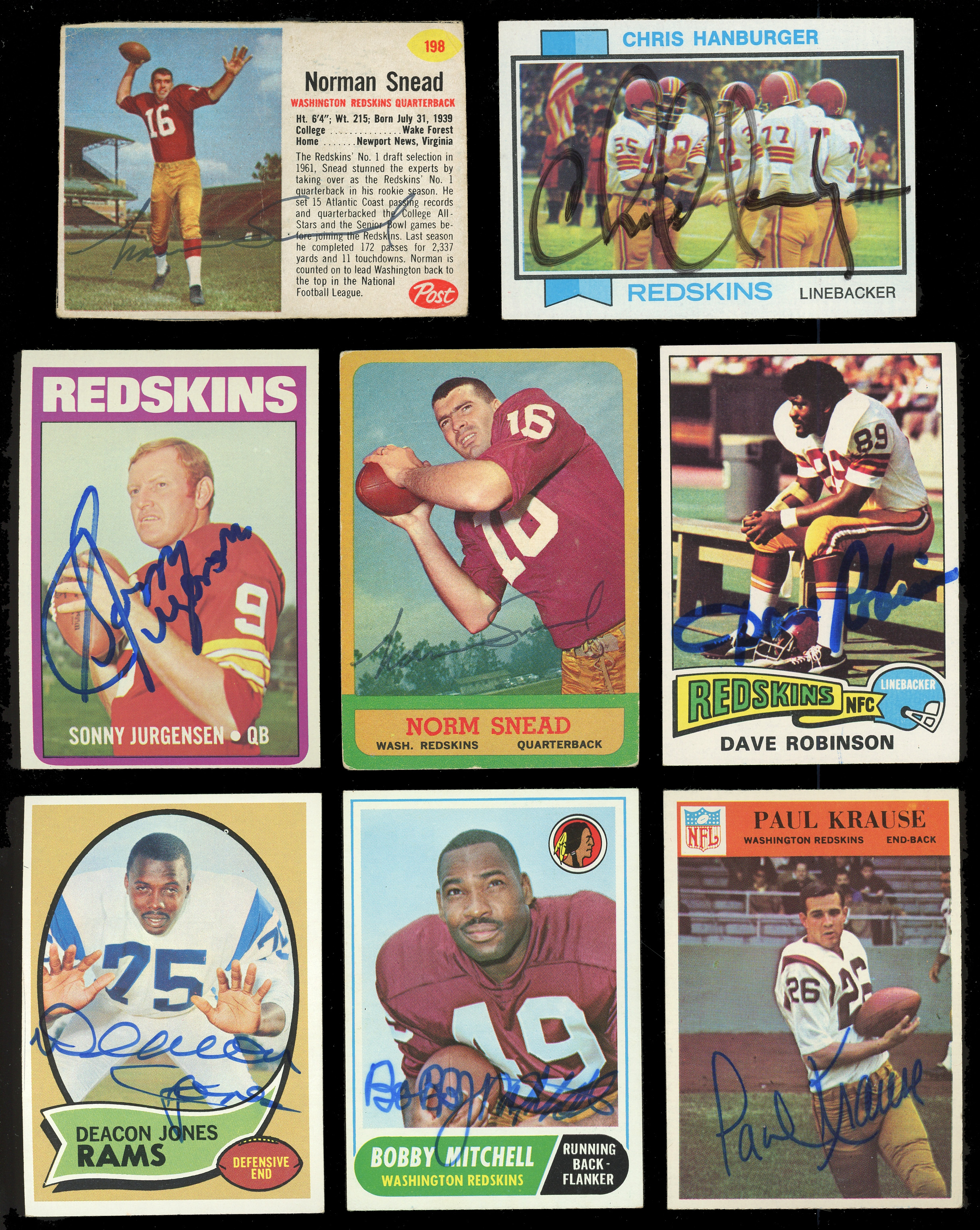 The District’s favorite sons are recognized with the offered 1948-1979 Washington Redskins related signed collection of (267) cards. Each card is signed by a Washington Redskins player, a player from another NFL franchise who once played for the Redskins or other former coaches/personnel. The surfaces generally project (“8”) penmanship with some better or lesser. Highlighted players include (Auction LOA from James Spence/JSA): (2) Baughan (one 1962 Topps, one 1969 Topps), L. Brown (1972 Topps), F. Davis (1948 Leaf), (2) Davidson (one 1966 Topps, one 1969 Topps), Dowler (one 1963 Topps, one 1965 Topps), (2) Fischer (one 1970 Topps, one 1971 Topps), Gray (1948 Bowman), (2) Hanburger (one 1970 Topps, one 1973 Topps), Hefti (1948 Bowman), (2) Houston (one 1978 Topps, one 1979 Topps), D. Jones (1970 Topps), (2) S. Jones (one 1960 Fleer, one 1961 Topps), Jurgensen (1972 Topps), Kiick (1972 Topps), (2) Krause (one 1965 Philadelphia Gum RC, one 1966 Philadelphia Gum), LeBaron (1963 Topps), Marchibroda (1958 Topps), McKee (1948 Bowman), B. Mitchell (1968 Topps), Moseley (1977 Topps), Nussbaumer (1948 Bowman), Pardee (1970 Topps), Poillon (1948 Bowman, personalized), (2) R. Renfro (one 1960 Topps, one 1961 Topps with personalized), (2) D. Robinson (one 1970 Topps, one 1975 Topps), J. Scott (one 1973 Topps, one 1978 Topps), (2) Snead (one 1962 Post, one 1963 Topps), Stanfel (1958 Topps) and Toneff (1960 Topps). The remainder are presumed authentic but have not been reviewed by a third party. The season breakdown is as follows: