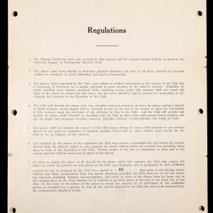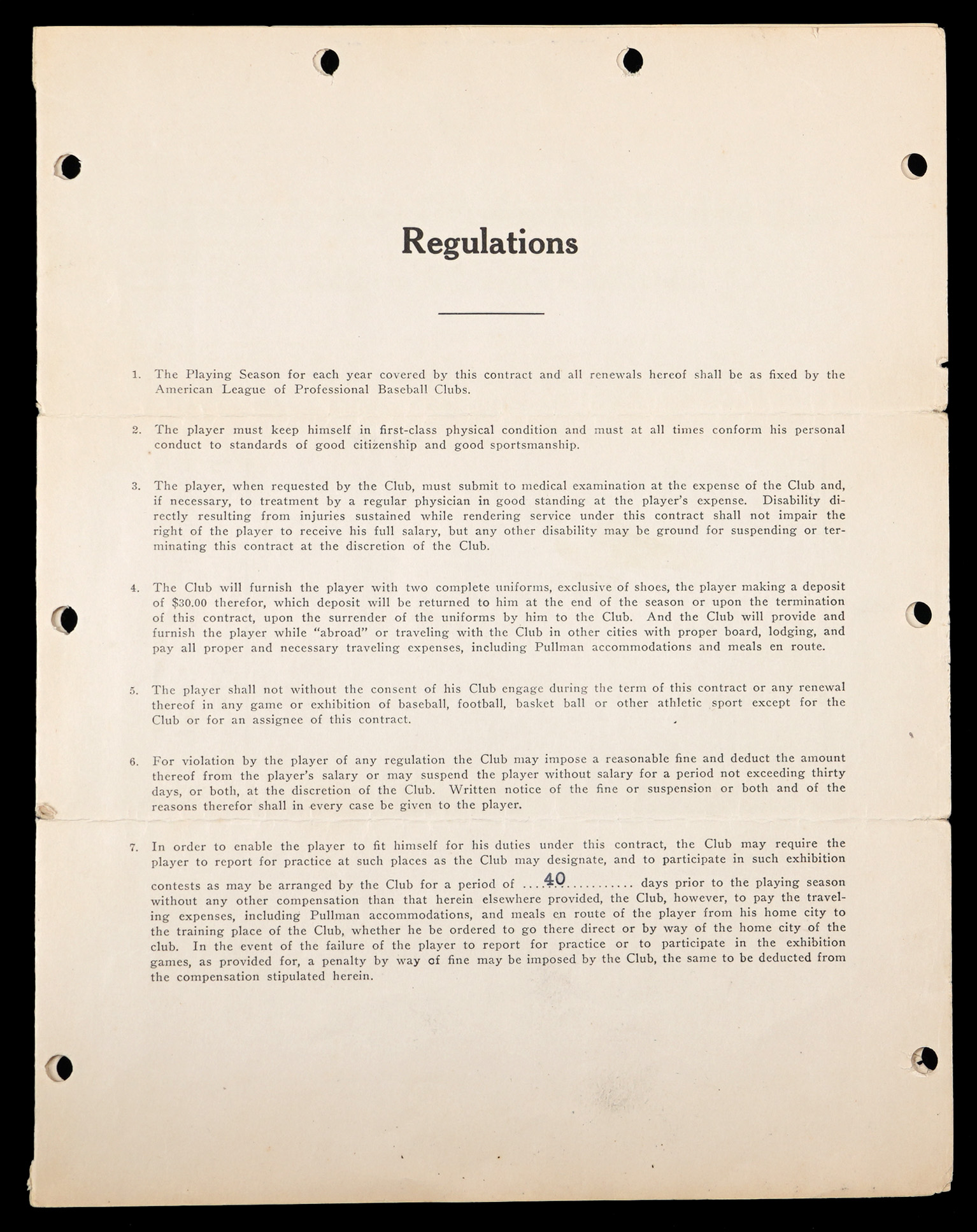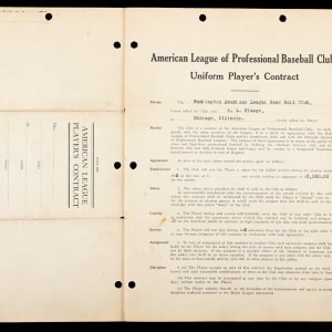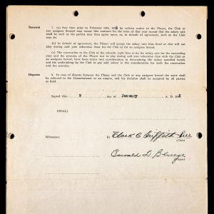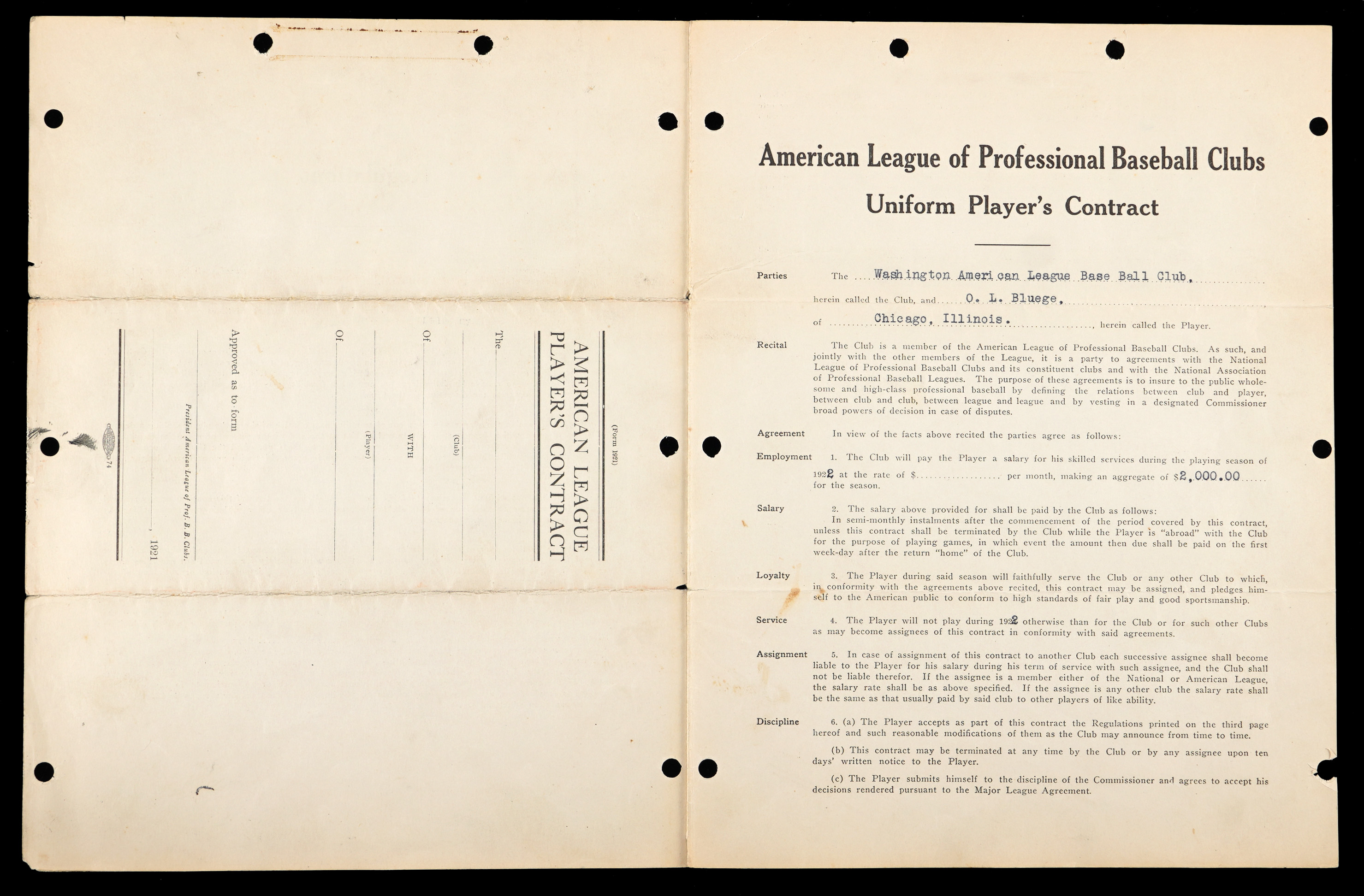This “American League of Professional Baseball Clubs Uniform Players Contract” was signed on January 9th, 1922, between the Washington club, represented by Hall of Famer Clark Griffith, and infielder Ossie Bluege. As this was Bluege's rookie year, it is his first major league contract. It is in Very Good condition with strong signatures (“9-10”) by “Clark C Griffith, Pres.” and “Oswald L. Bluege.”