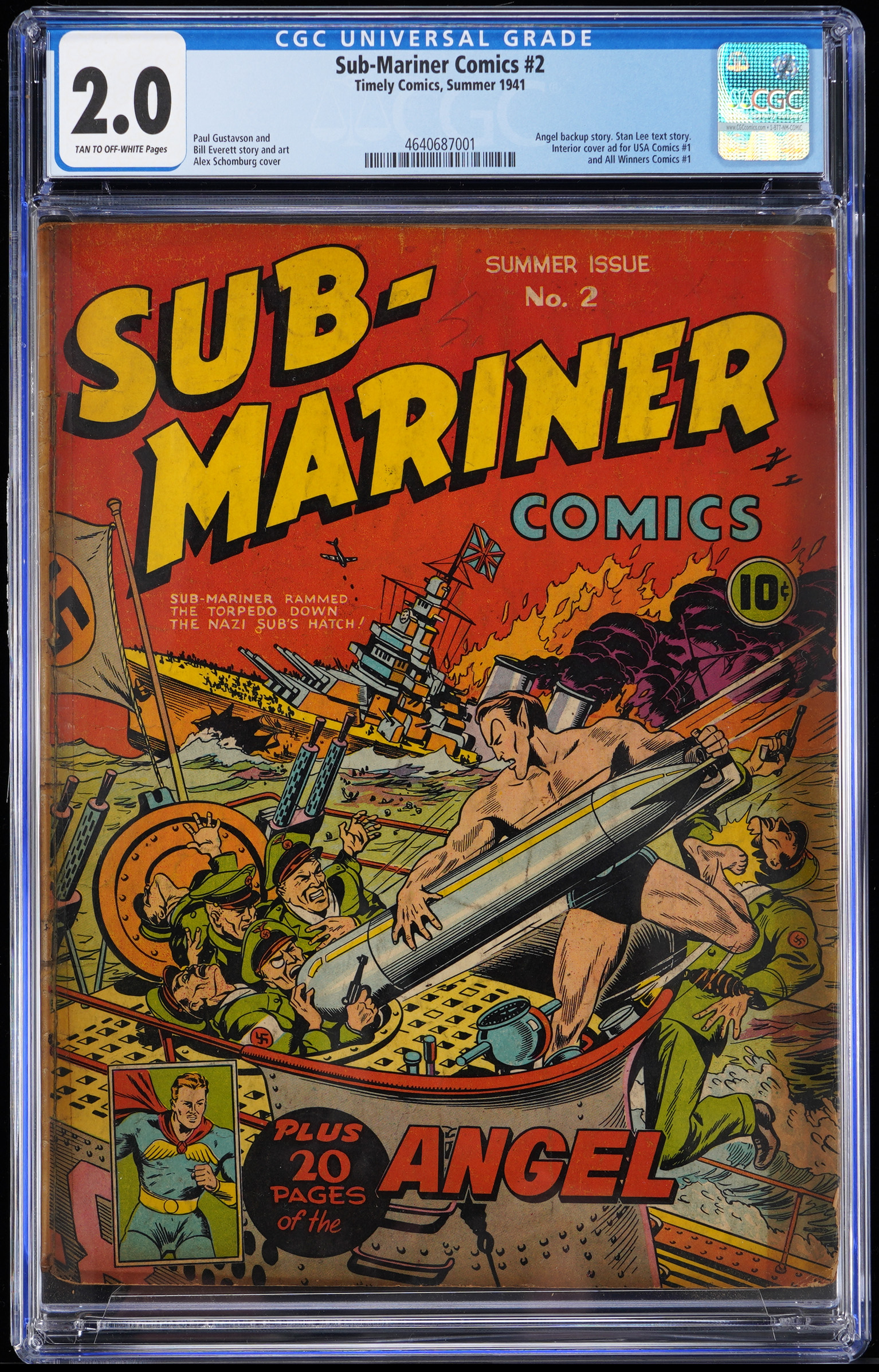 Several important creators were involved with the production of this arresting issue, with art and story by Bill Everett, cover by Alex Schomburg, and a back-up story by the great Stan Lee. Pretty much an office "gofer" at the time, Lee had his first writing assignment in the May 1941 Captain America Comics #3 issue, and his work in this Summer 1941 Sub-Mariner #2 issue, counts as one of his earliest writing efforts. CGC has graded just sixty-five examples of this ancient issue to date, indicating the scarcity of surviving copies. CGC has graded this one 2.0, Tan to Off-White Pages. Label notes are "Paul Gustavson and Bill Everett story and art, Alex Schomburg cover. Angel backup story. Stan Lee text story. Interior cover ad for USA Comics #1 and All Winners Comics #1".