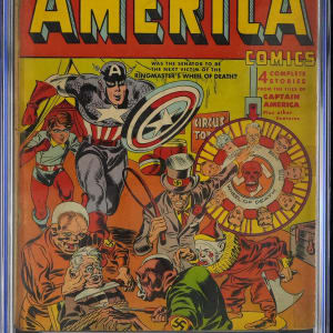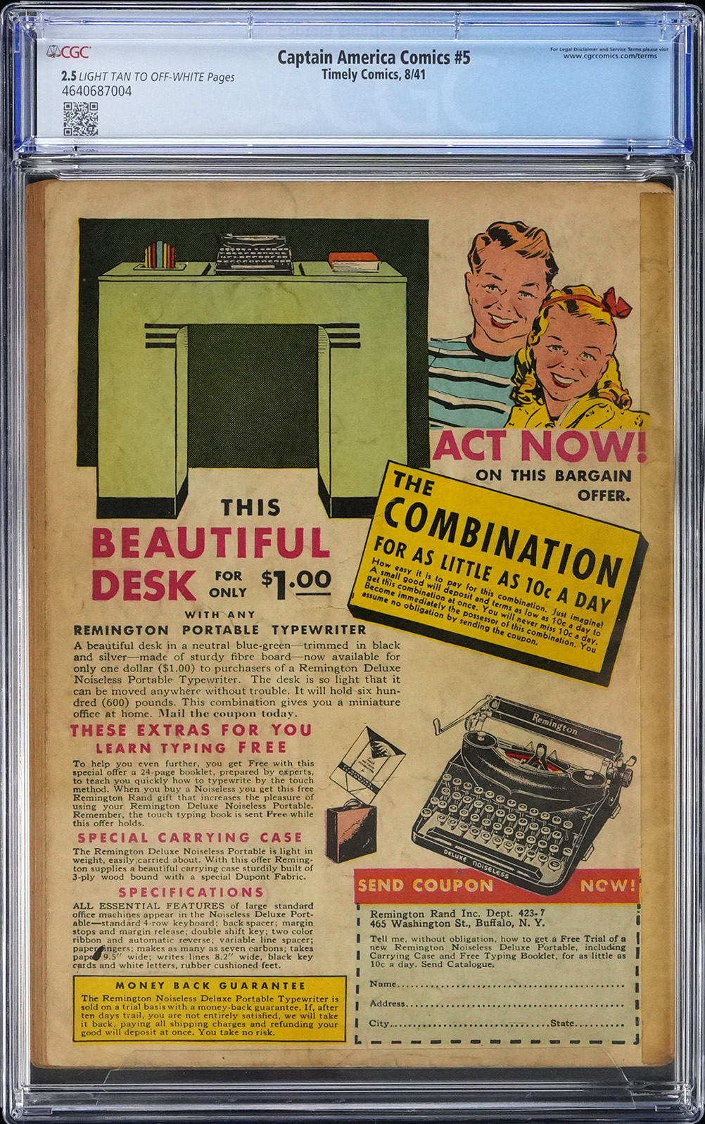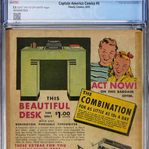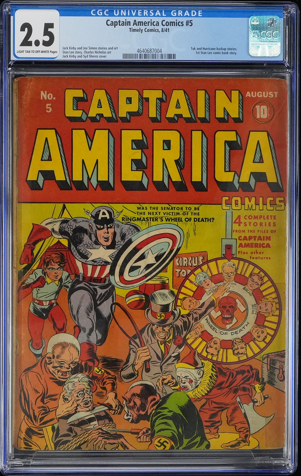 Face the Ringmaster's Wheel of Death, when you gaze upon this 8/41 Timely Comics Captain America Comics #5 issue. From one of the most treasured titles in the history of comic books, this thrilling Golden Age issue is fronted with a truly classic cover by legend Jack "The King" Kirby. Centering the Nazi torture wheel the Ringmaster is set to spin, is nefarious super-villain the Red Skull. Still not hooked, ok here comes the clincher. While Stan Lee did his first writing in the #3 issue of this sacred title, it was a two-page text filler. This #5 issue features Lee's first actual comic book story, ""Headline" Hunter, Foreign Correspondent". Long-secluded by a dedicated collector, this bigtime Golden Age comic has just returned from CGC with a grade of 2.5, Light Tan to Off-White Pages. Label notes are "Jack Kirby and Joe Simon stories and art, Stan Lee story, Charles Nicholas art, Jack Kirby and Syd Shores cover. Tuk and Hurricane backup stories. 1st Stan Lee comic book story.".