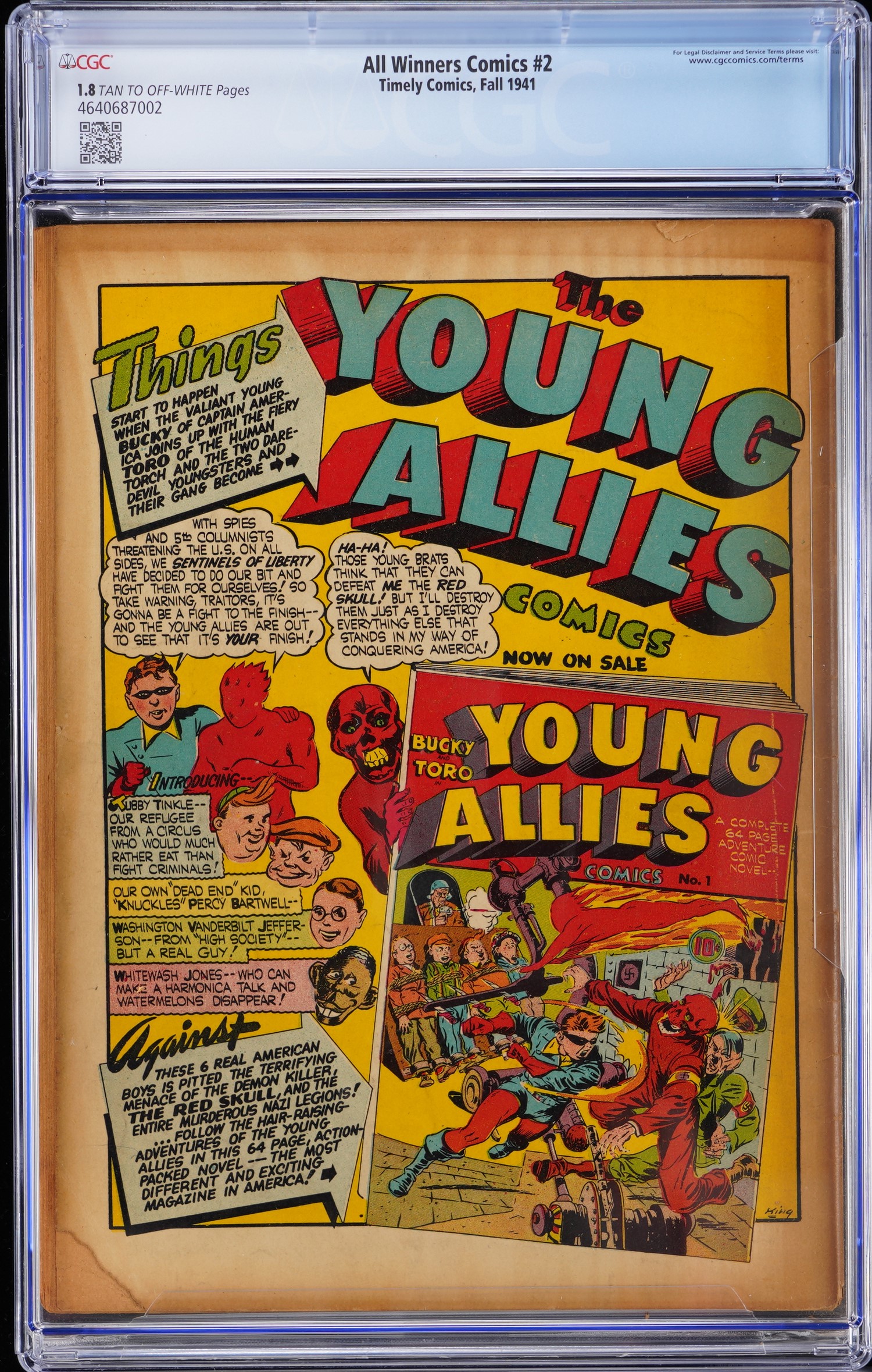 Make your way to the winner's circle, with this 1941 Timely Comics All Winners #2 issue. This prized Golden Age comic offers a salute from Timely's "Big Three", the Human Torch, Captain America, and the Sub-Mariner, who are seen with sidekicks Bucky, Toro, and other heroes on the compelling cover. Even more impressive than these important super-heroes, are the contributing creators Stan Lee, Jack Kirby, Joe Simon, Carl Burgos, Jack Binder, and Paul Reinman. The back cover is a treat as well, with an ad for the Young Allies #1 issue, which was on sale concurrently with this All Winners comic. CGC's Population Report notes a relatively small total of fifty-four copies of this #2 issue have been encapsulated in Universal Grade holders to date, so even this CGC graded 1.8, Tan to Off-White Pages example is a sweet find. Label notes are "Carl Burgos and Stan Lee stories, Jack Kirby, Paul Reinman, Carl Burgos, Jack Binder and Joe Simon art. Destroyer and Whizzer begin. Hitler appearance. Back cover ad for Young Allies #1".