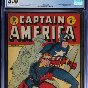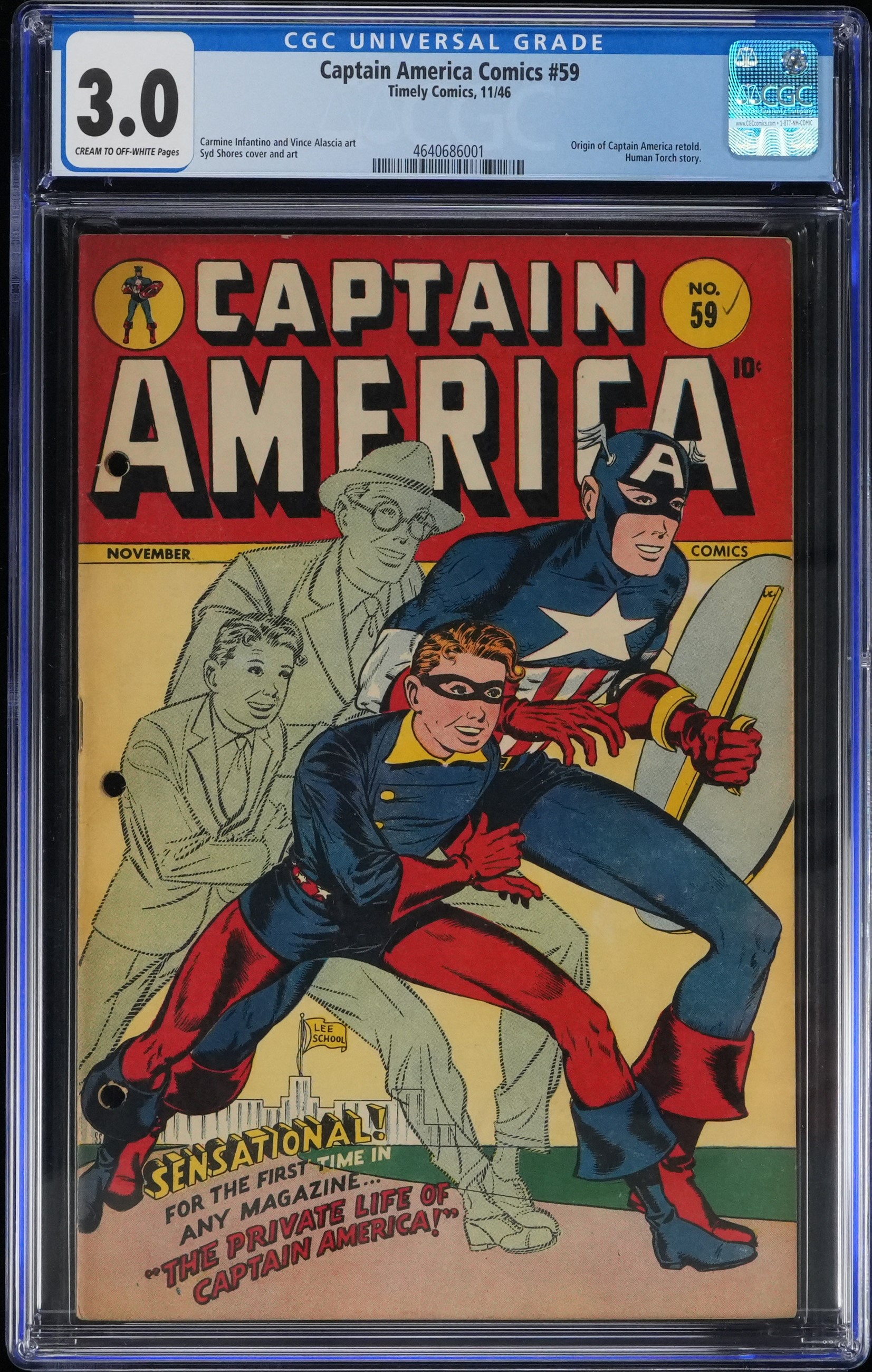 A captivating cover recommends this 11/46 Timely Comics Captain America Comics #59 issue. The war was over, and there were no more Axis powers to fight, so super-hero comics were exploring other avenues. This one teases "The Private Life of Captain America" on the front cover, luring readers with an iconic cover, and the promise of a look at the lifestyle of Steve Rogers. This Golden Age comic also retells the origin story of how the frail Rogers from Manhattan's Lower East Side, became a super soldier in the fight for freedom. Taking part in the creation of this vintage comic, are the great Carmine Infantino, and Syd Shores.