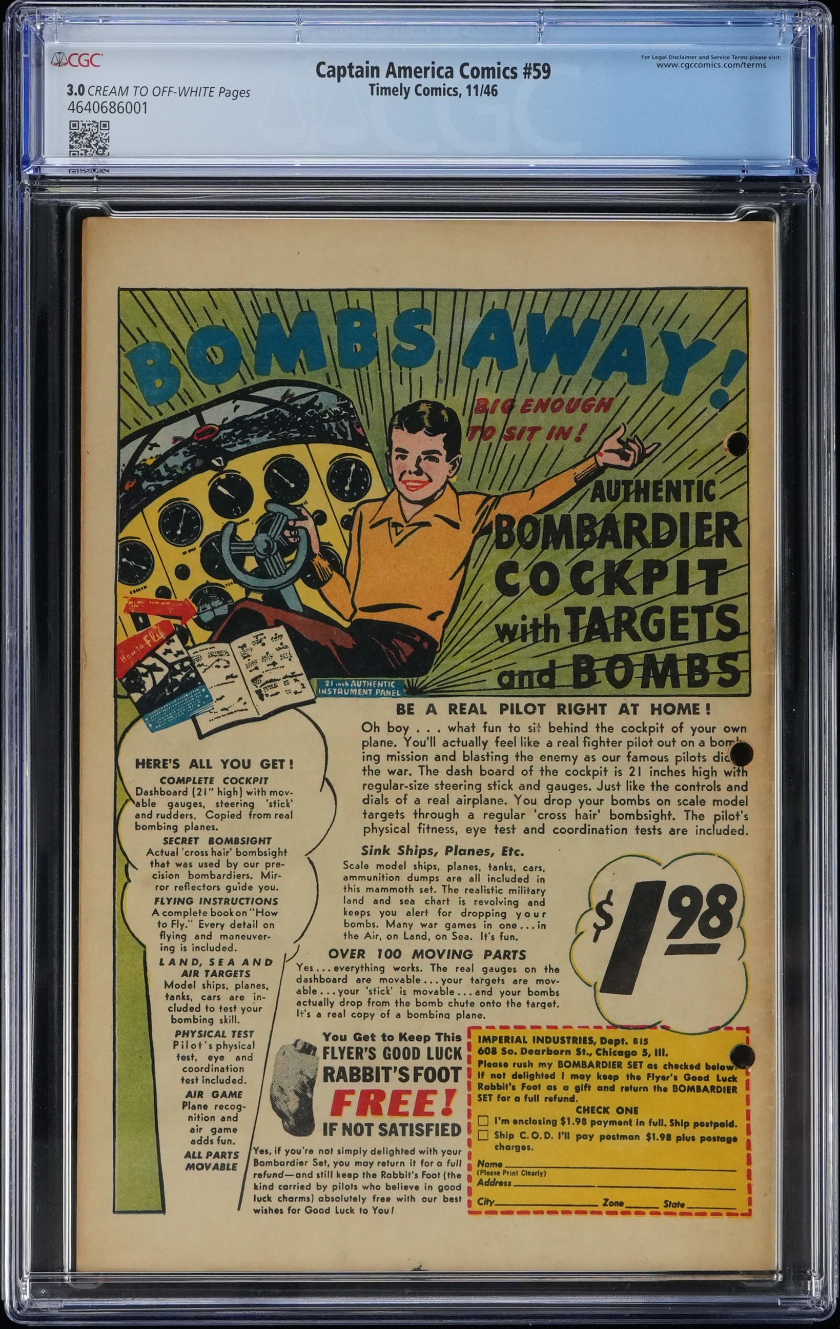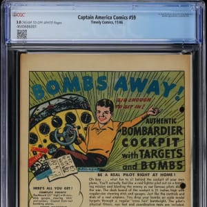 Three hole punches near the spine were examined prior to grading submission, and they pass through the margins of the pages only, without affecting the artwork, or story. CGC has furnished a grade of 3.0, Cream to Off-White Pages, in a Universal Grade holder. If not for the hole punches, this handsome comic would have graded in the 6.5 to 7.0 range, it's that attractive. Label notes are "Carmine Infantino and Vince Alascia art, Syd Shores cover and art. Origin of Captain America retold. Human Torch story.".
