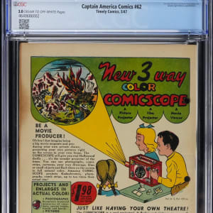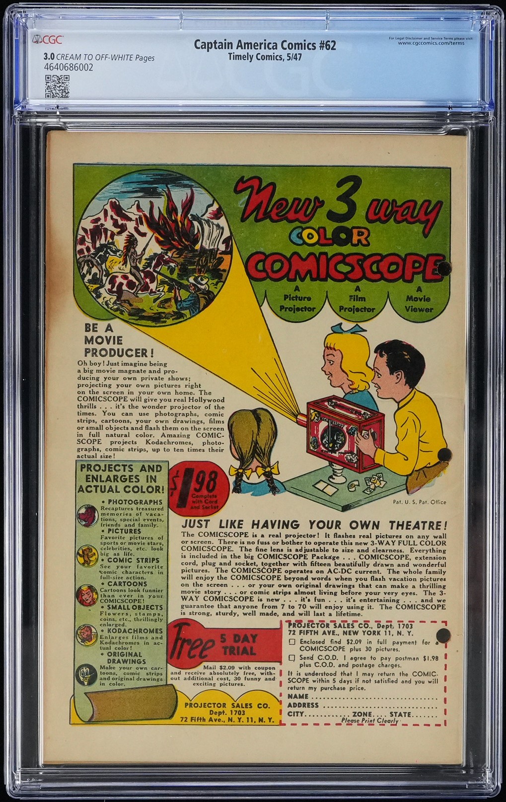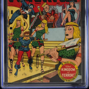 Things aren't looking good for Bucky, on the front cover of this 5/47 Timely Comics Captain America Comics #62 issue. Captain America's loyal sidekick is trussed up by a couple of blonde Amazon-like warriors dragging him to a third of their kind, who awaits to deliver a fatal blow with her razor-sharp axe. Looking on are the diabolical Black Baron and the alluring Queenie, who watch from their shared throne in "The Kingdom of Terror". This masterpiece cover was rendered by artist Syd Shores. Stan Lee and Otto Binder wrote the stories for this issue, and Al Avison and Carmine Infantino did the artwork. CGC has graded this vintage comic 3.0, Cream to Off-White Pages, and were it not for hole punches next to the spine, this book would have graded a good bit higher, perhaps 7.0, give or take a little. Label notes are "Otto Binder and Stan Lee stories, Al Avison and Carmine Infantino art, Syd Shores cover and art. Human Torch backup story.".