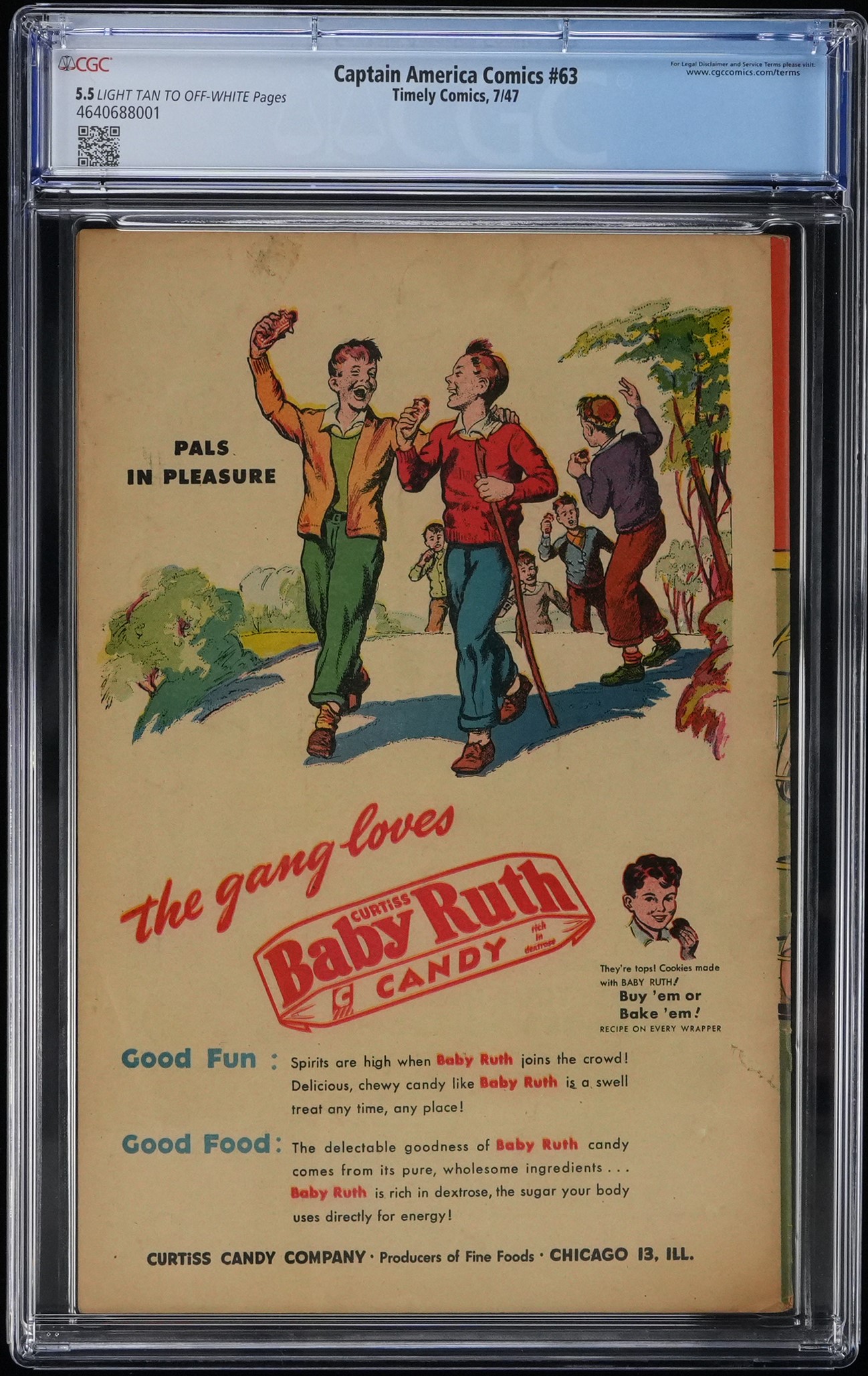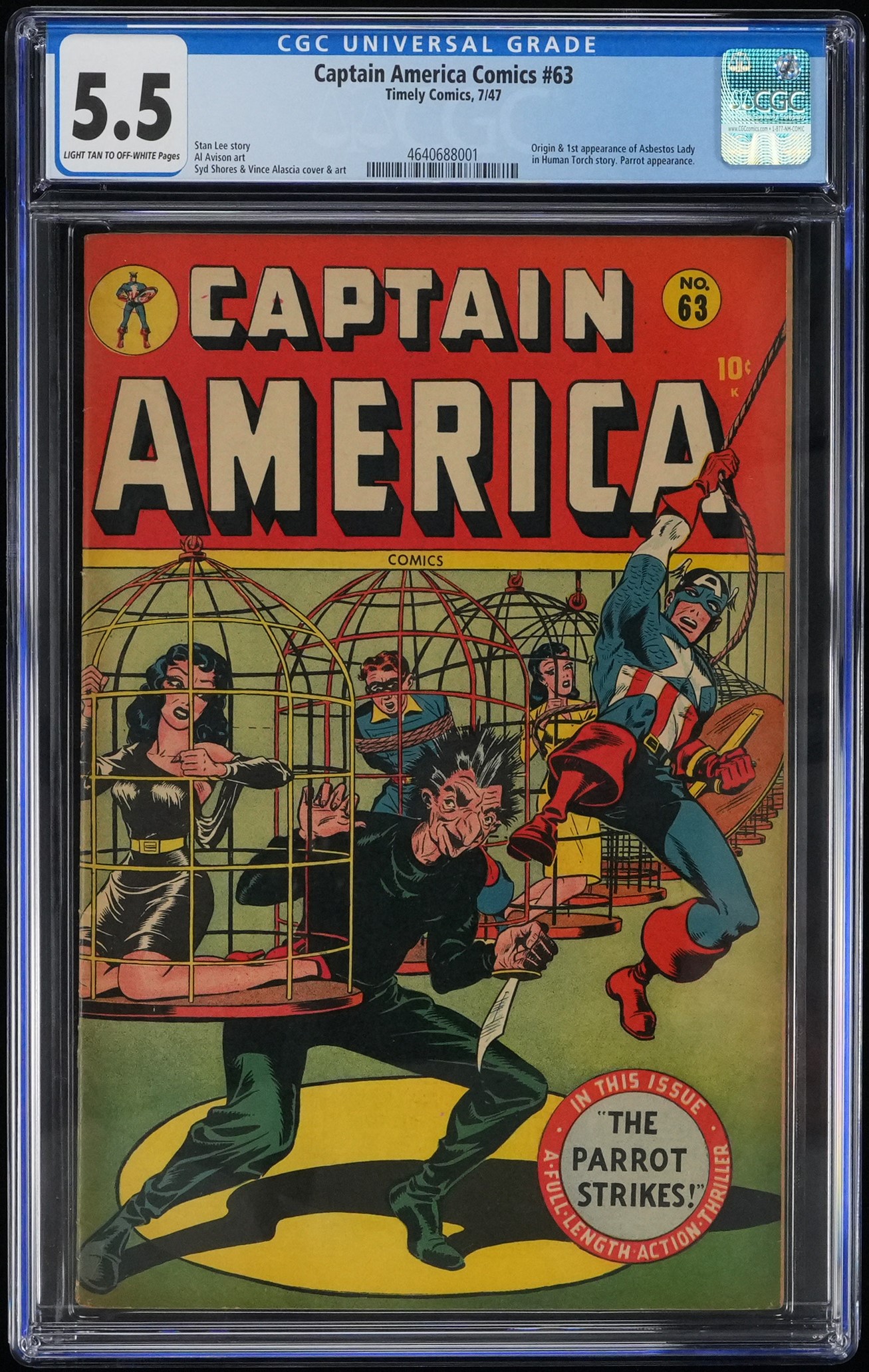 Become one of the fifty-eight collectors to own a CGC graded example of this 1947 Timely Comics Captain America Comics #63 issue, when you lay claim to this nicely preserved Golden Age comic book. Captain America is facing a strange bird in this pre-code issue, who is holding Bucky and a couple of lovely ladies captive in hanging cages. The main story villain is the Parrot, and Asbestos Lady makes her debut in a back-up Human Torch tale. CGC has graded this ancient comic a desirable 5.5, Light Tan to Off-White Pages. CGC's Population Report reports ranks this handsome example in the middle of the pack, of a relatively small total population of fifty-eight. Label notes are "Stan Lee story, Al Avison art, Syd Shores & Vince Alascia cover & art. Origin & 1st appearance of Asbestos Lady in Human Torch story. Parrot appearance.".