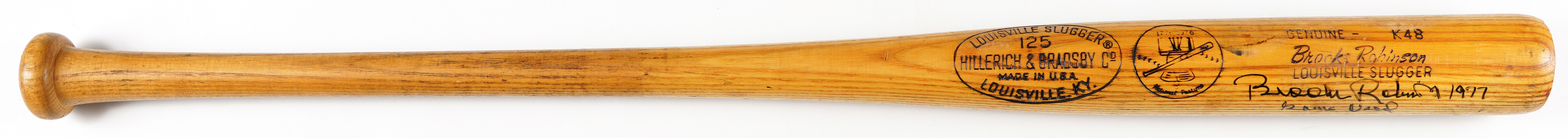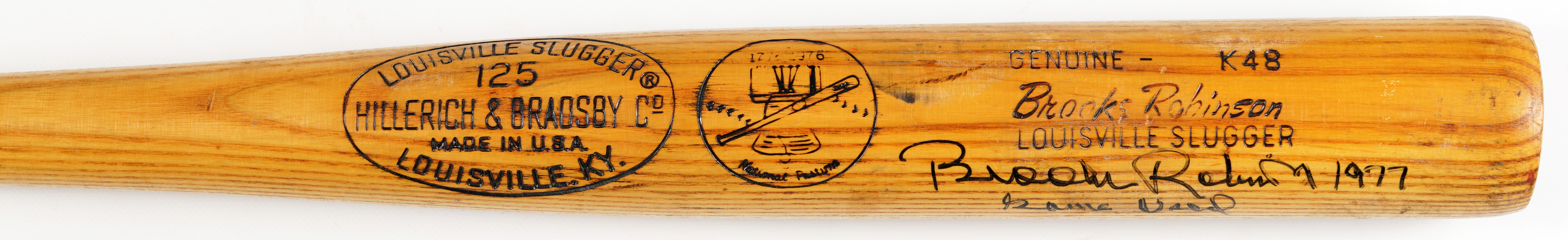 A tremendous treasure from a revered Hall of Famer arrives, with this Brooks Robinson signed and inscribed 1976 Baltimore Orioles game-used bat. A Louisville Slugger Genuine K48 Robinson signature model, this fantastic gamer is impressed on the barrel with a Bicentennial logo, featuring the Liberty Bell. Authentic characteristics and and excellent signs of use are evident, with contact marks and baseball stich impressions on the barrel, a cupped barrel end, pine tar residue on the un-cracked handle, and Robinson's uniform number "5" written on the knob.