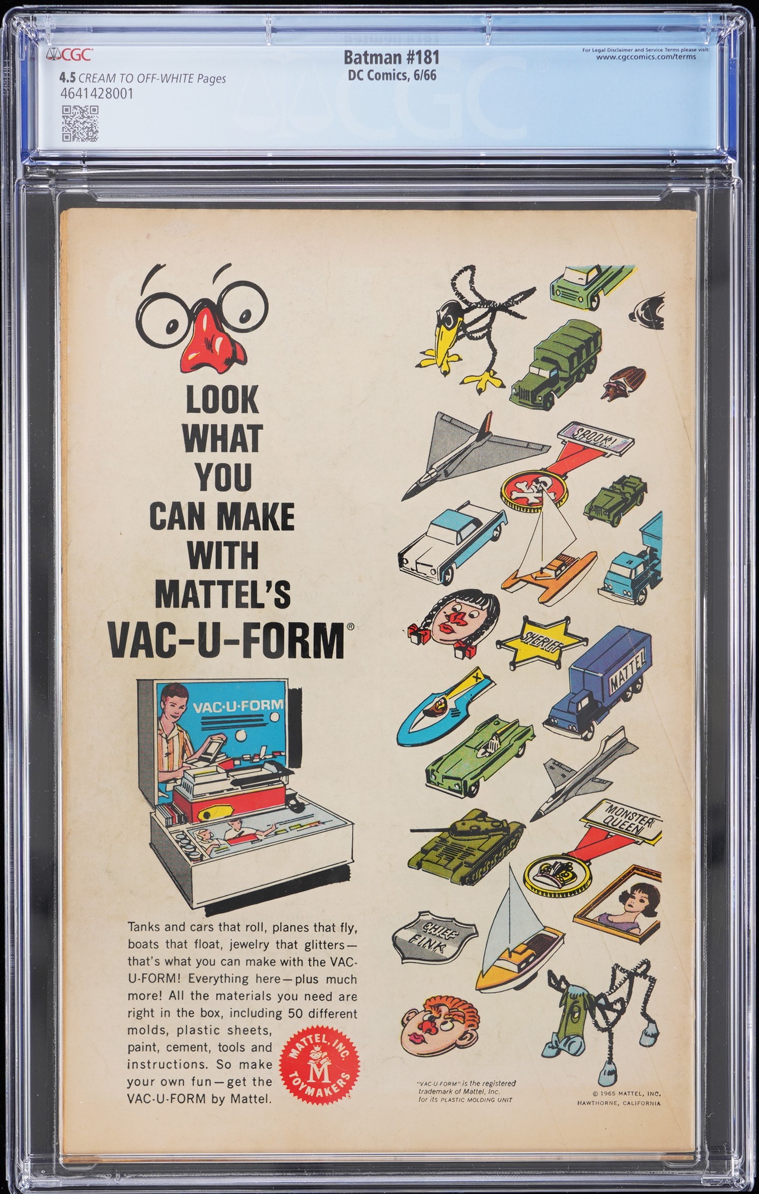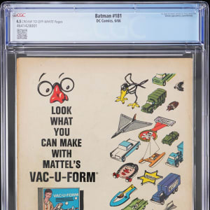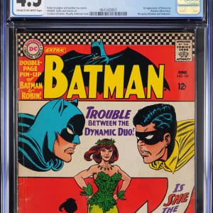 Scratch your collecting itch, with this 6/66 DC Batman #181 issue. This classic Silver Age comic stands as the first appearance of alluring, but deadly super-villain Poison Ivy. An enchanting eco-terrorist with green thumbs and fingers, Ivy has the ability to control all plant life at her whim, and she is capable of seducing just about anyone through pheromonal arousal. Surrender to her charms, and go all in for this satisfying comic, which has earned a 4.5, Cream to Off-White Pages rating from leading certification service, CGC. Label notes are "Robert Kanigher and Gardner Fox stories, Moldoff, Giella and Greene art, Carmine Infantino, Murphy Anderson cover. 1st appearance of Poison Ivy (Pamela Lillian Isley). Pin-up by Infantino and Anderson.".