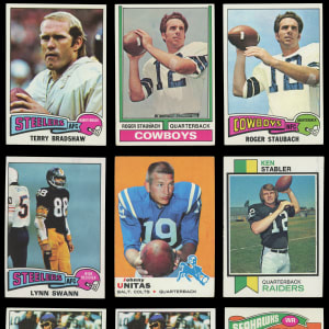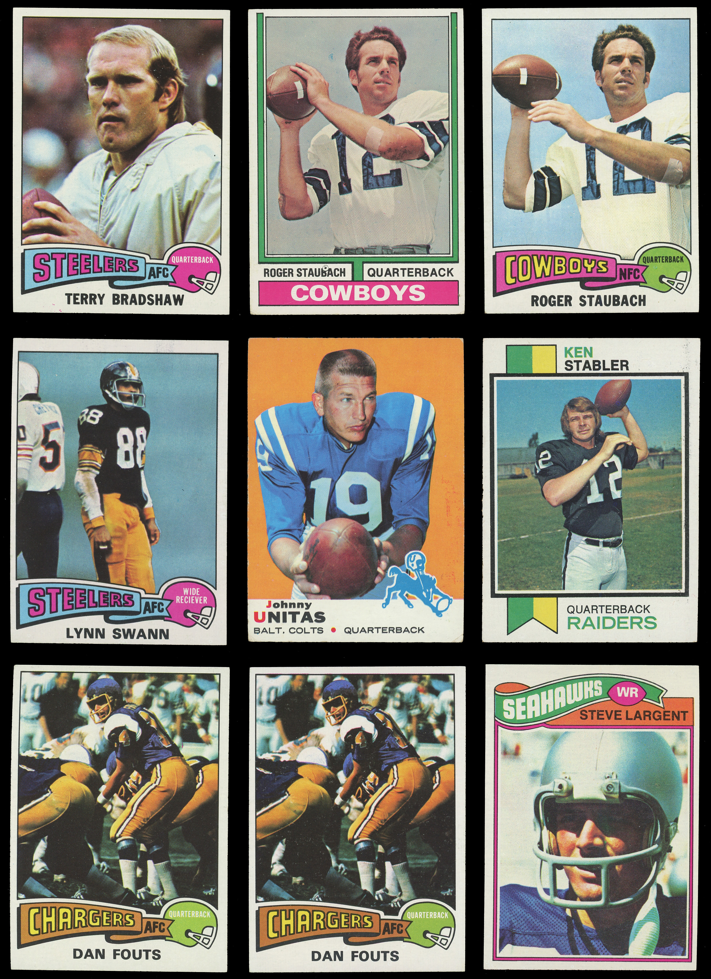 1975 Topps: (83 stars, average EX to EX-MT) with #145 Staubach (EX), #282 Swann RC (EX), (2) #367 Fouts RC (both EX-MT), #380 Stabler (VG), #461 Bradshaw (EX-MT), (2) #500 Simpson (both EX-MT), #524 Branch RC (EX);