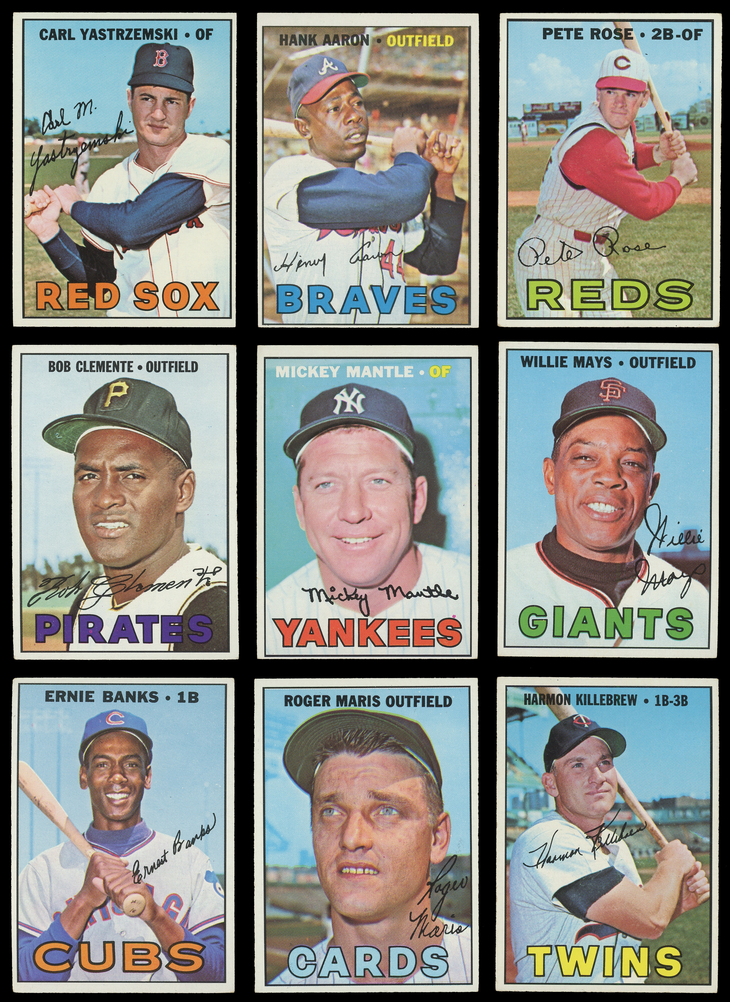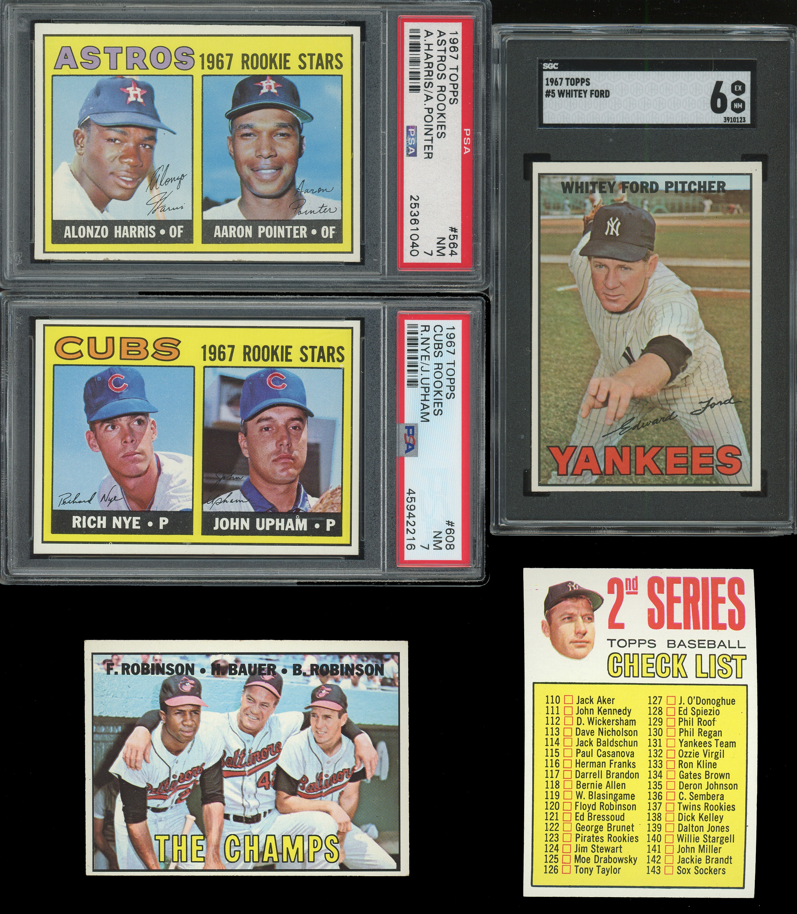Seize more than 90% of the 1967 Topps edition with the offered near complete set of (553/609) cards. This premium assembly has an approximate condition breakdown of 20% (EX-MT or better), 30% (EX), 30% (VG-EX) and 20% (VG or lesser) with the (28) tougher higher series generally presenting similarly. Highlights include: #1 The Champs (EX), #5 Ford (SGC EX/NM 6), #30 Kaline (EX), #45 Maris (EX-MT), #100 F. Robinson (VG-EX), #103 Mantle CL (NM), #146 Carlton (VG), #150 Mantle (VG-EX), #200 Mays (EX-MT), #210 Gibson (EX), #215 Banks (VG), #250 Aaron (VG-EX), #355 Yastrzemski (EX), #400 Clemente (EX), #423 Mays/McCovey (VG), #430 Rose (VG-EX), #445 Sutton (VG), #460 Killebrew (EX-MT), #475 Palmer (EX-MT), #476 Perez (VG-EX), #480 McCovey (VG), #564 Astros Rookies (PSA NM 7) and #608 Cubs Rookies (PSA NM 7).