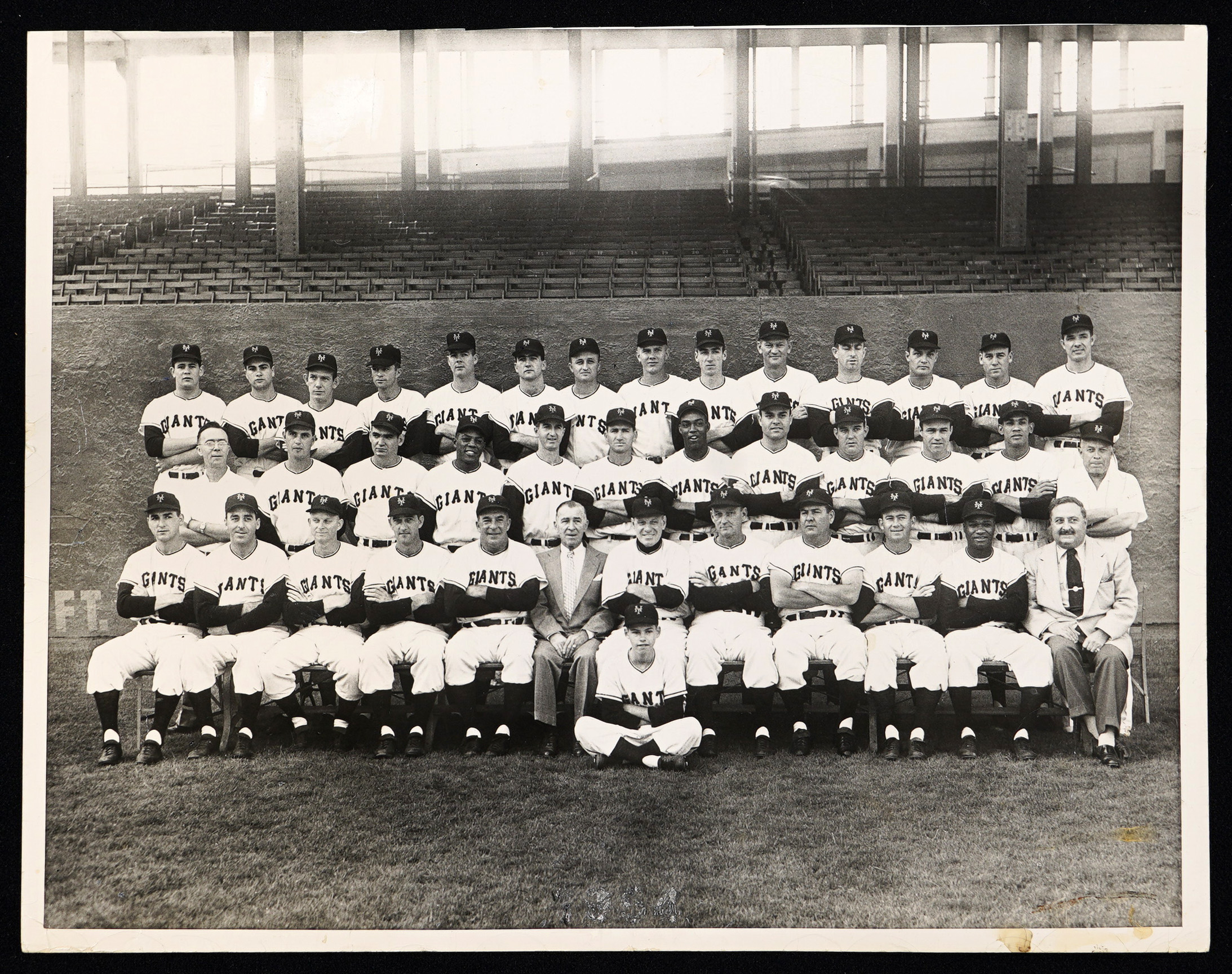 The 1954 world champion New York Giants are recalled, with this original New York Daily Mirror 11" x 14" photograph. Under the guidance of Hall of Fame manager Leo Durocher, the 1954 Giants didn't just beat the heavily favored, 111-win Cleveland Indians in the World Series, they swept them in four games, thanks in part to "The Catch" by Willie Mays, and some timely hitting heroics by "Dusty" Rhodes. Seen in this oversized photograph, are Durocher at center of the first row, and fellow Hall of Famers Mays fourth from left in the second row, Monte Irvin sixth from right in the second row, and Hoyt Wilhelm second from left in the second row. Also noted are aces Johnny Antonelli, Sal Maglie, and Ruben Gomez; stars Rhodes, Al Dark, Don Mueller, "Whitey" Lockman, and Hank Thompson; future NBC sportscaster Joe Garagiola; and coach Freddie Fitzsimmons. Though this vintage photograph rates as GD due to moderate creases, it still presents handsomely, with distinct images, and nice gloss.