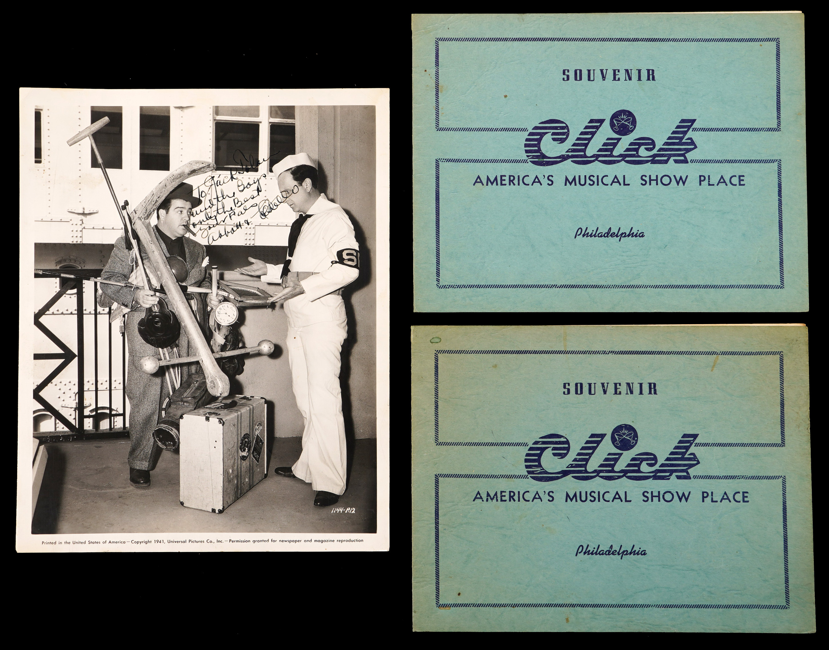 Universal Pictures 8" x 10" publicity still from the 1941 film "In the Navy", is signed "Abbott and Costello" with a personalized salutation, all in Abbott's hand.
