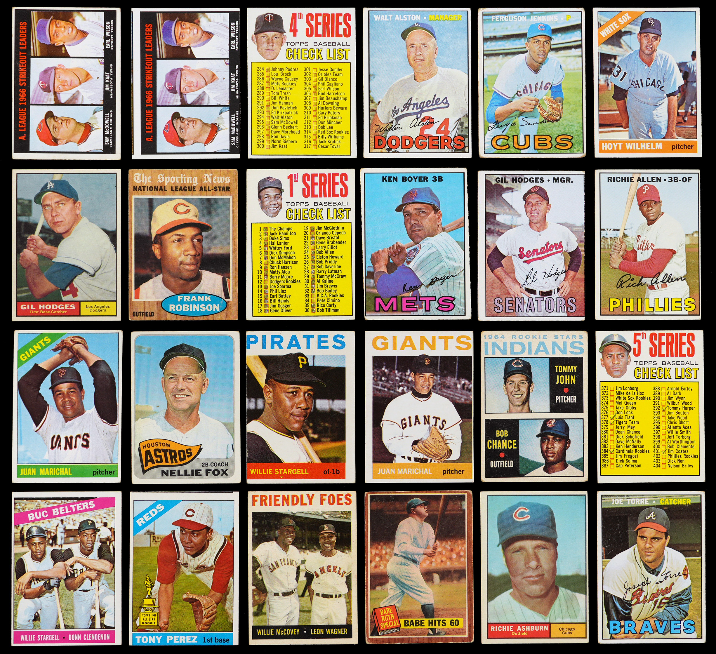 1966 Topps: (305 cards, average GD to VG, includes one high number) with #72 Perez (GD), #99 Stargell/Clendenon (GD), #120 Killebrew (VG), #132 Cepeda (GD), #160 Ford (VG), #210 Mazeroski (VG-EX), #365 Maris (VG), #420 Marichal (VG), #510 Wilhelm (EX-MT);