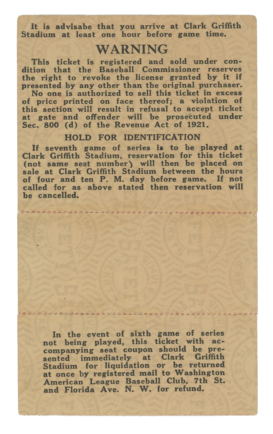 It's been over a century since the Washington Senators staved off elimination and won Game 6 of the 1924 World Series en route to capturing the franchise's only title. Presented is a Lower Box Grandstand ticket that survived the fireworks at Griffith Stadium that October afternoon. This antique collectible features the top, Rain Check and Game 6 sections of the period voucher. Each portion has been neatly reattached via mild/moderate adhesive on the reverse and the front black-and-white event details are crisp and attractive. An incredibly scarce D.C. area heirloom that exhibits very impressive eye appeal.