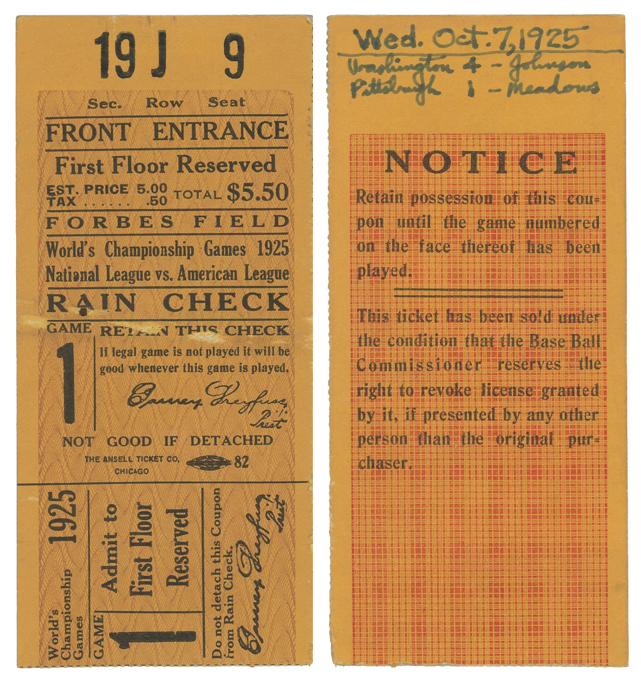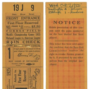 Big Train World Series Victory! Before a capacity crowd at Pittsburgh's Forbes Field, Washington Senators Hall of Fame ace Walter Johnson stymied the hometown Pirates 4-1 in Game 1 of the 1925 World Series. Although the Bucs would ultimately stymie the Senators back-to-back quest, this antique voucher is a key survivor of the century-old Fall Classic. While the yellow First Floor Reserve stub displays a hint of front paper loss, the event/seating details are pitch black and clearly legible. The game details are noted on the reverse in blue ink.