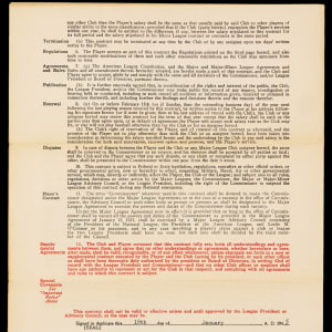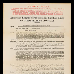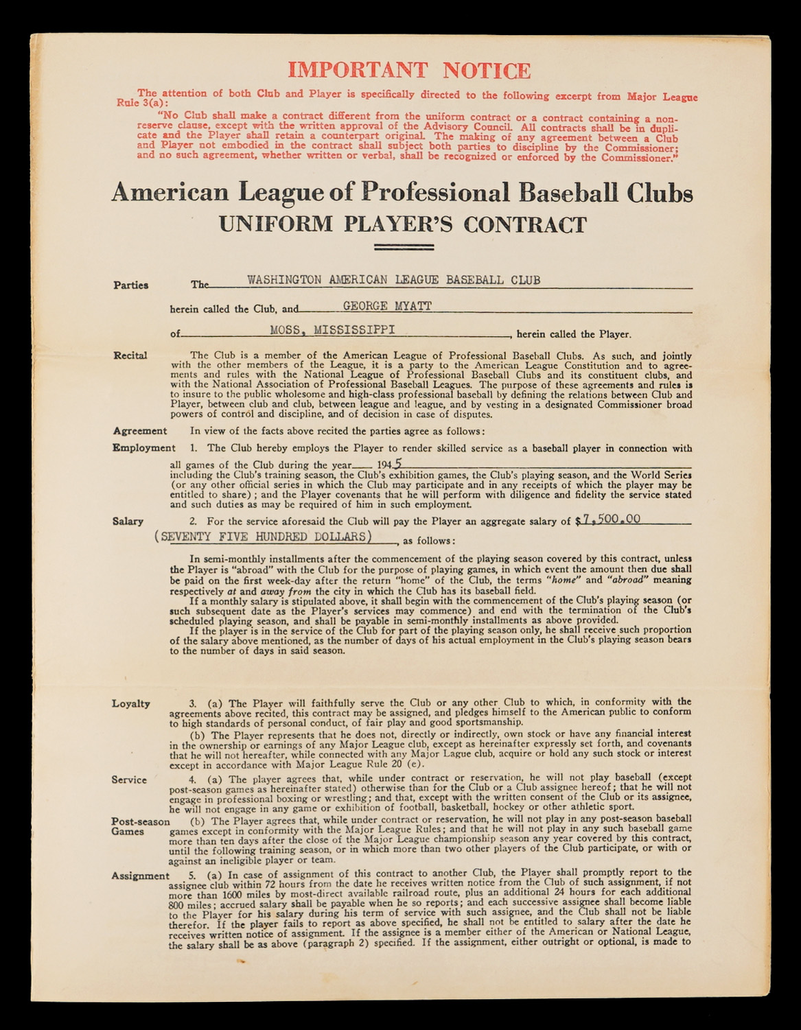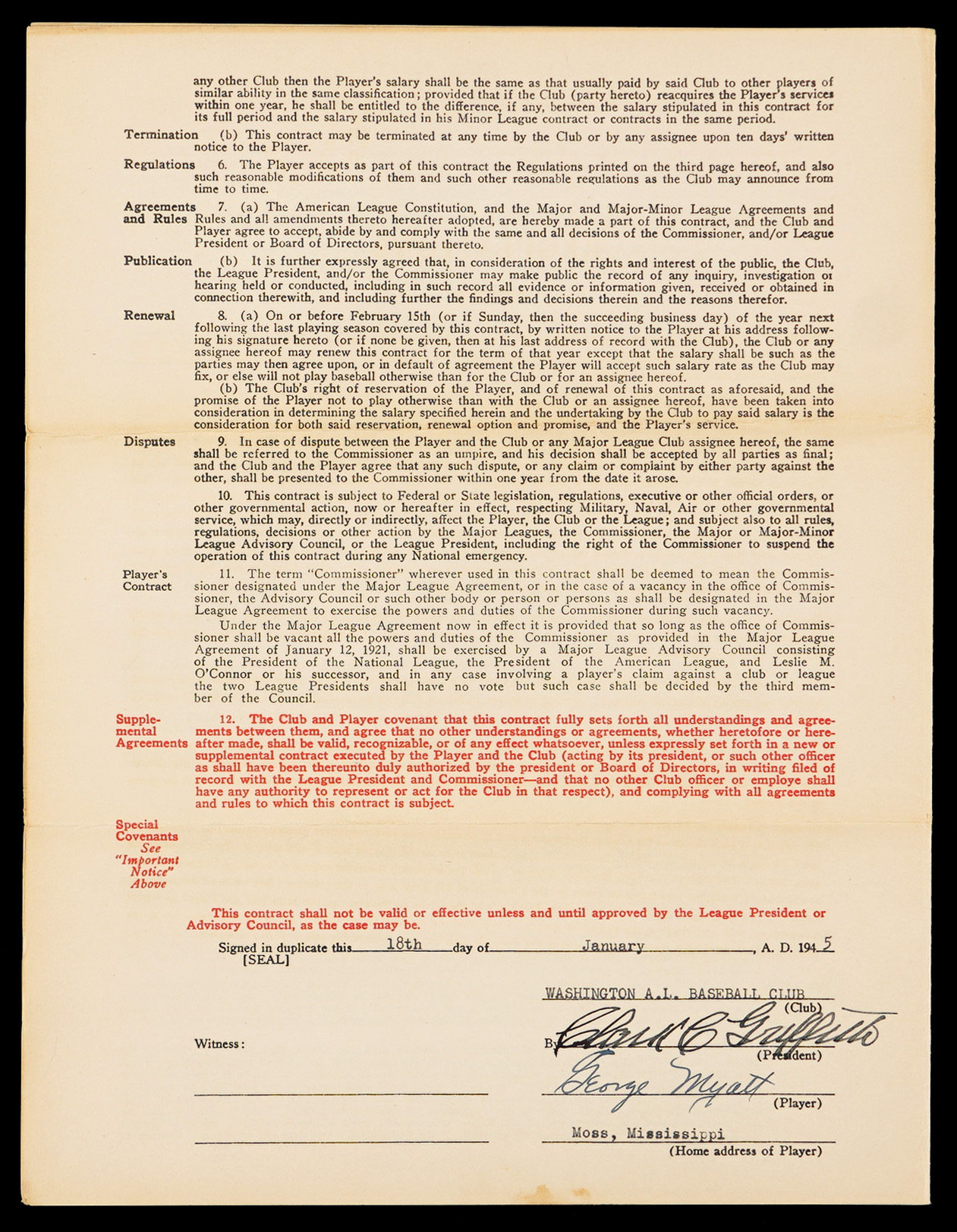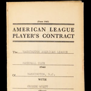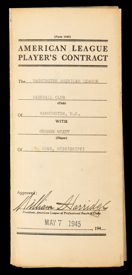 This “American League of Professional Baseball Clubs Uniform Player’s Contract” dated January 18th, 1945, between the Washington American League Baseball Club and infielder George Myatt, is in Excellent condition. Washington President, Clark C. Griffith, has signed the last page as a representative of the club and George Myatt has signed beneath. The contract has been approved and signed in the outside folded area by President of the American League, William Harridge. The three signatures average (“8-9”).