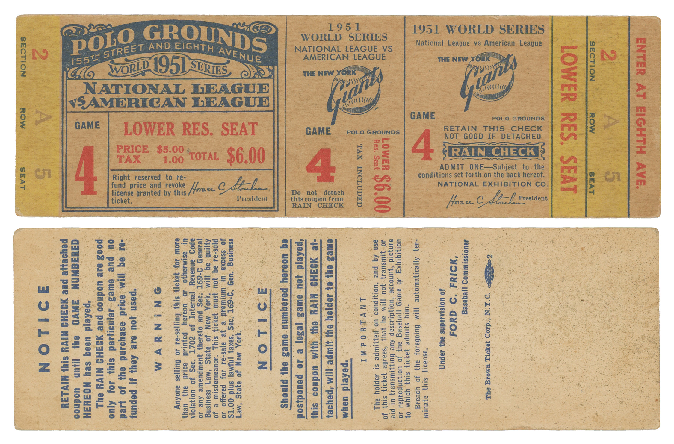 "The Shot Heard 'Round the World" wasn't enough to propel the 1951 New York Giants to a World Series title as the cross-town Yankees bested the National League champs by a 4-2 margin. Presented is a Game 4 full and unused ticket that witnessed the New York Yankees top the Giants by a 6-2 score (Joe DiMaggio last World Series home run). The complete Lower Reserved seat presents in overall (VG) condition with moderately rounded corners, slight vertical creasing and bold event details. The reverse displays only a hint of reverse residue. The first World Series for Hall of Famers Mickey Mantle and Willie Mays.