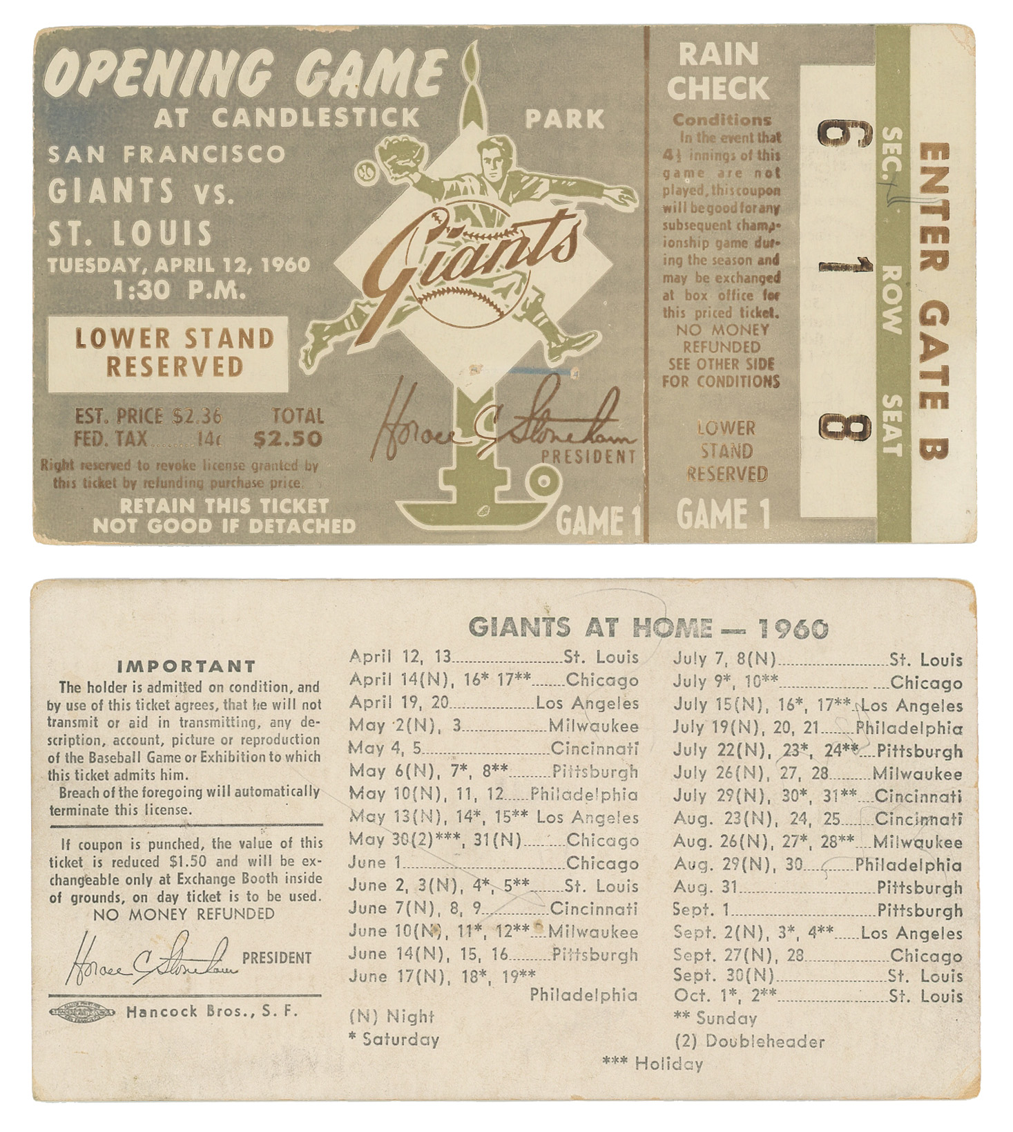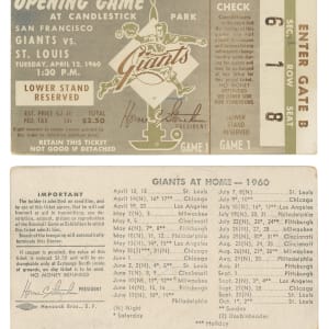 Candlestick Park opened with great fanfare on April 12, 1960. The ceremonial first pitch was thrown by Vice President Richard Nixon. The home team San Francisco Giants defeated the St. Louis Cardinals 3 to 1. This ticket with “Opening Game at Candlestick Park” at the top was specially made for the occasion. VG-EX condition.