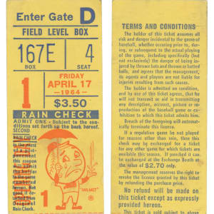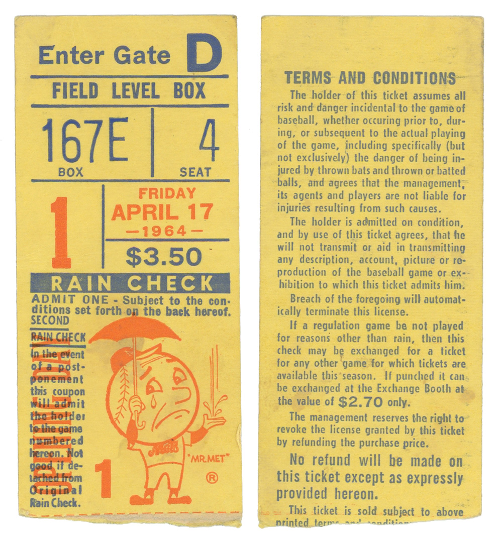 When Shea Stadium opened in 1964, it was considered state-of-the-art and it remains one of the most beautiful stadiums in baseball. The Pirates won the inaugural game by a score of 4-3, with the Pirates’ Willie Stargell hitting the first home run at Shea. He went 4 for 5 with the home run, two RBI's and two runs scored. Roberto Clemente also contributed with a 3 for 5 and two runs. The ticket stub from the game is in Excellent condition with Mr. Met lamenting a possible rain out.
