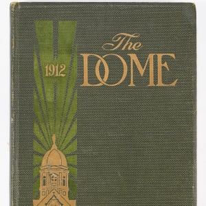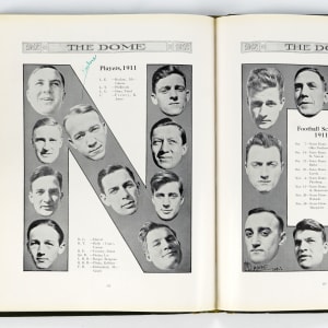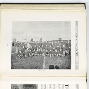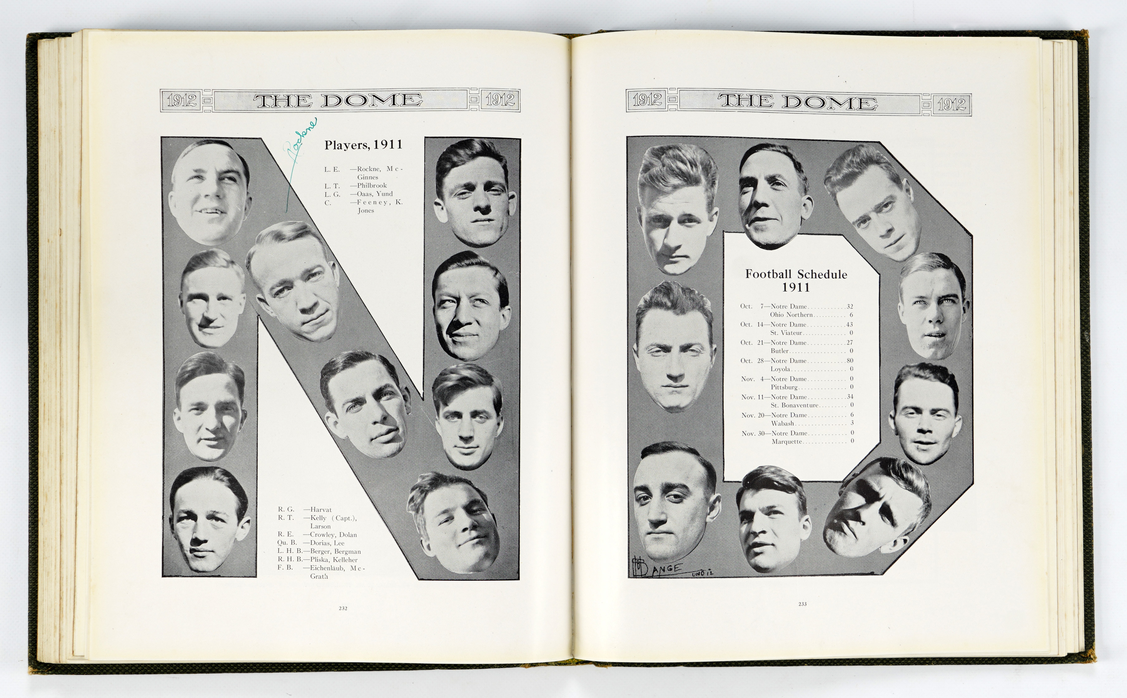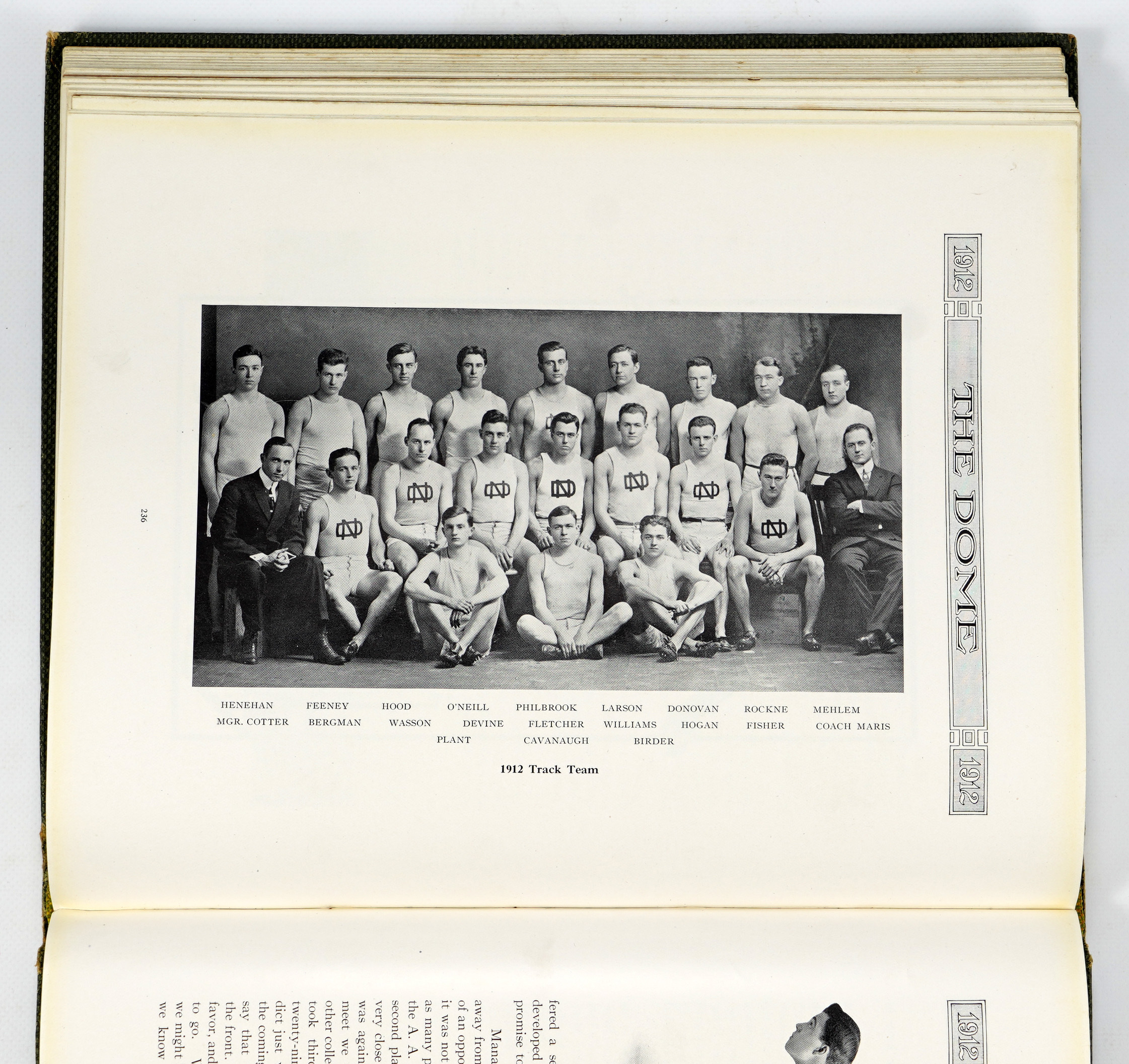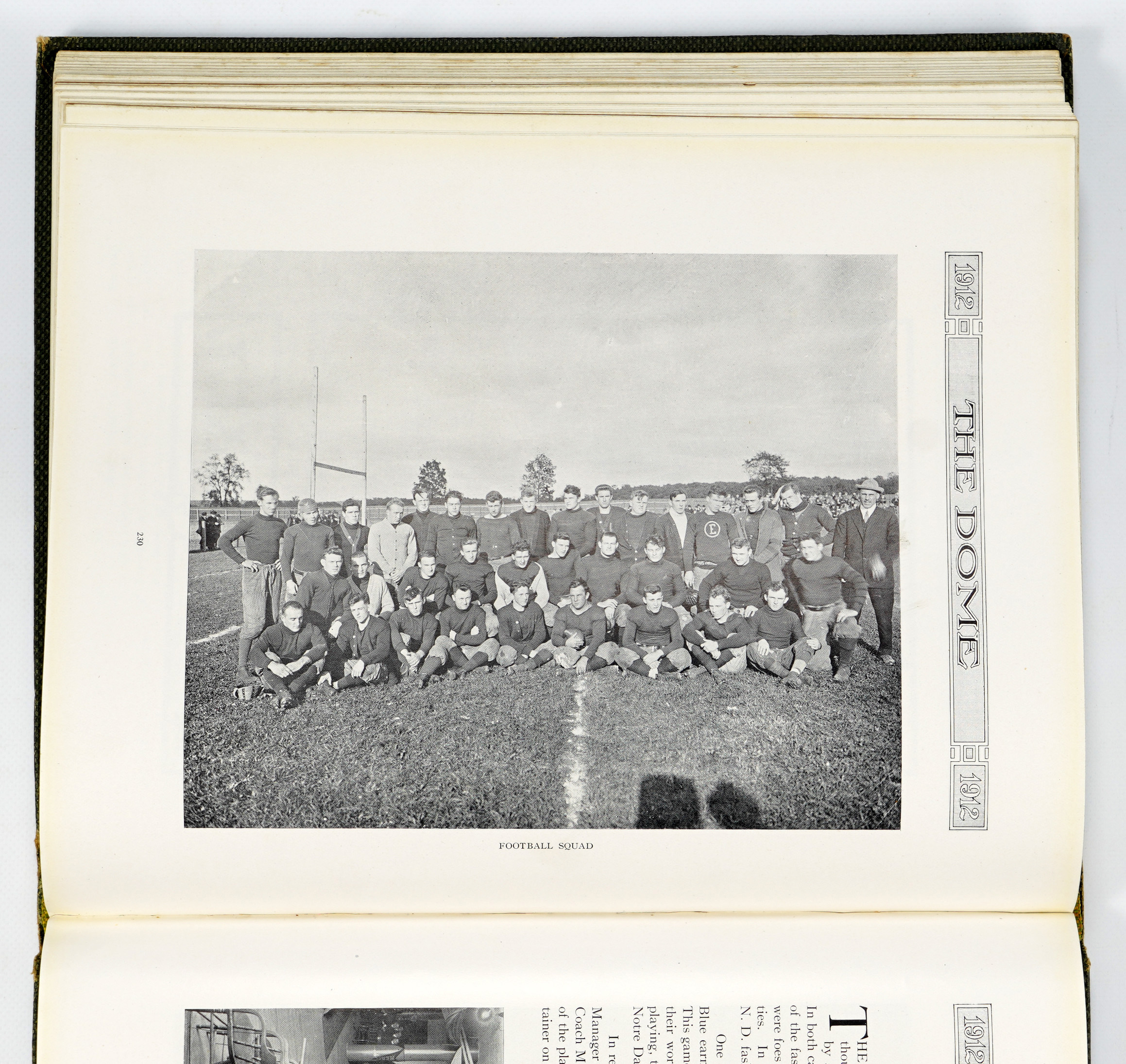 College football’s most renowned coach Knute Rockne is spotlighted, with this antique publication from his formative days as a collegiate player. Presented is a 1912 University of Notre Dame yearbook in solid and appealing condition. This ancient edition of “The Dome” features four different group photographs with Rockne, along with a printed “Directory” listing that shows his name as “Kenneth Rockne” on page 174.