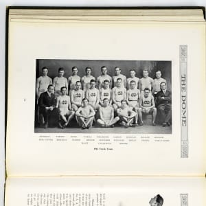 Fittingly, Rockne is first seen on page 230 in a team photograph. On page 232 he is pictured with his teammates, including Dorias. He next appears on page 236 as a member of the track team. His fourth and final appearance comes on page 245, pictured with his fellow “Monogram Men”, a stalwart bunch of lettermen attired in their UND sweaters.