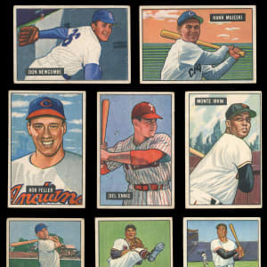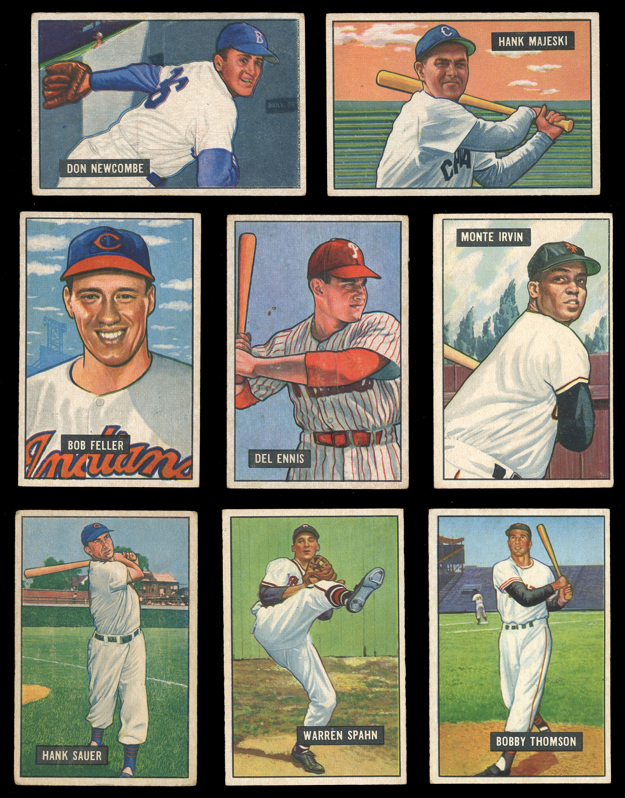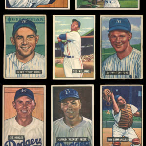 Impressive 1951 Bowman starter set of (155/324) cards with (18) Hall of Famers featuring a “Splendid Splinter” and key rookie card! This worthy compilation generally averages (VG) condition with some better or lesser. A lone high number is present. Highlights include: #1 Ford RC (GD), #2 Berra (GD), #3 Roberts (PR), #7 Hodges (GD), #10 Schoendienst (VG), #30 Feller (VG-EX), #31 Campanella (GD), #32 Snider (VG), #46 Kell (VG), #53 Lemon (VG), #58 Slaughter (VG), #62 Boudreau (GD), #78 Wynn (VG), #80 Reese (VG), #81 Furillo (VG), #122 Garagiola RC (VG-EX), #134 Spahn (VG-EX), #143 Kluszewski (VG-EX), #151 Doby (VG-EX), #165 T. Williams (VG) and #198 Irvin RC (VG).