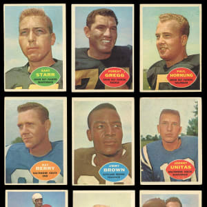 Pound the line with the offered 1960 Topps Football complete set of (132) cards. This hard-hitting edition has an overall approximate condition breakdown of 20% (EX-MT or better), 35% (EX), 25% (VG-EX) and 20% (VG or lesser). Highlights include: #1 Unitas (GD), #4 Berry (VG-EX), #23 J. Brown (VG-EX), #51 Starr (GD), #54 Hornung (EX-MT), #56 Gregg RC (VG-EX), #74 Gifford (VG-EX), #93 Layne (VG-EX) and #113 Tittle (VG).