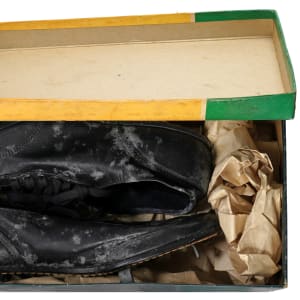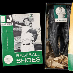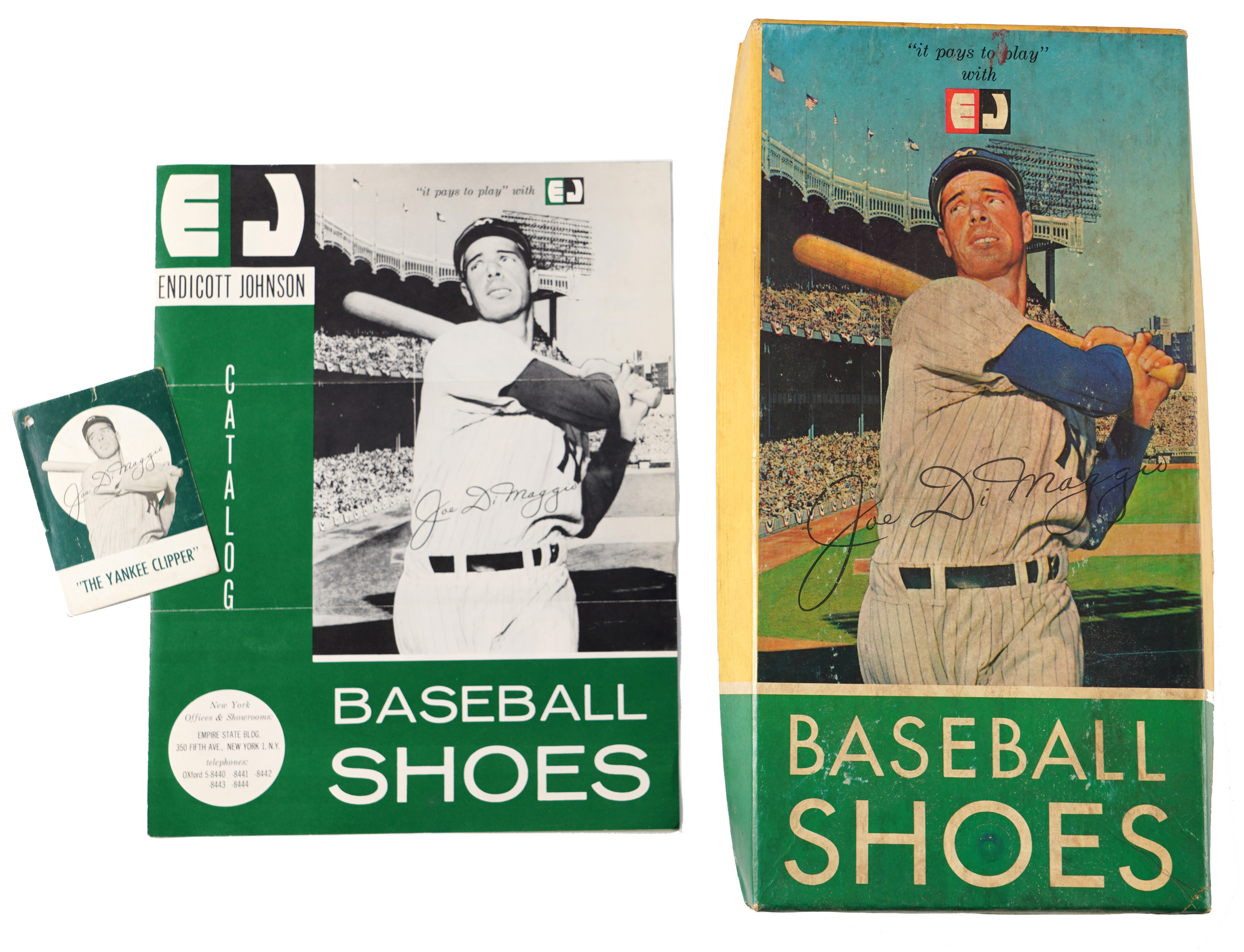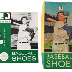 You've seen Joe DiMaggio baseball shoes in the original box before, but you haven't seen the extremely rare salesman sample brochure from Endicott Johnson Corp. Athletic Division. The 4-page brochure advertising Joe DiMaggio Little League shoes is in EX-MT condition with brochure folds. The shoes and box in this lot show some deterioration, grading GD-VG. The third item in this lot is a “Yankee Clipper” card-size hangtag with Joe's lifetime stats on the back (EX). All three items feature the same photo of the legendary leader of the Bronx Bombers.