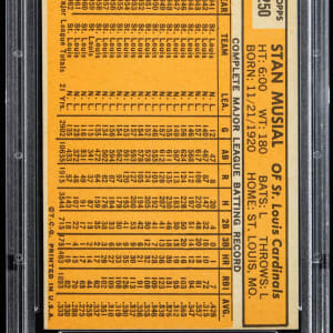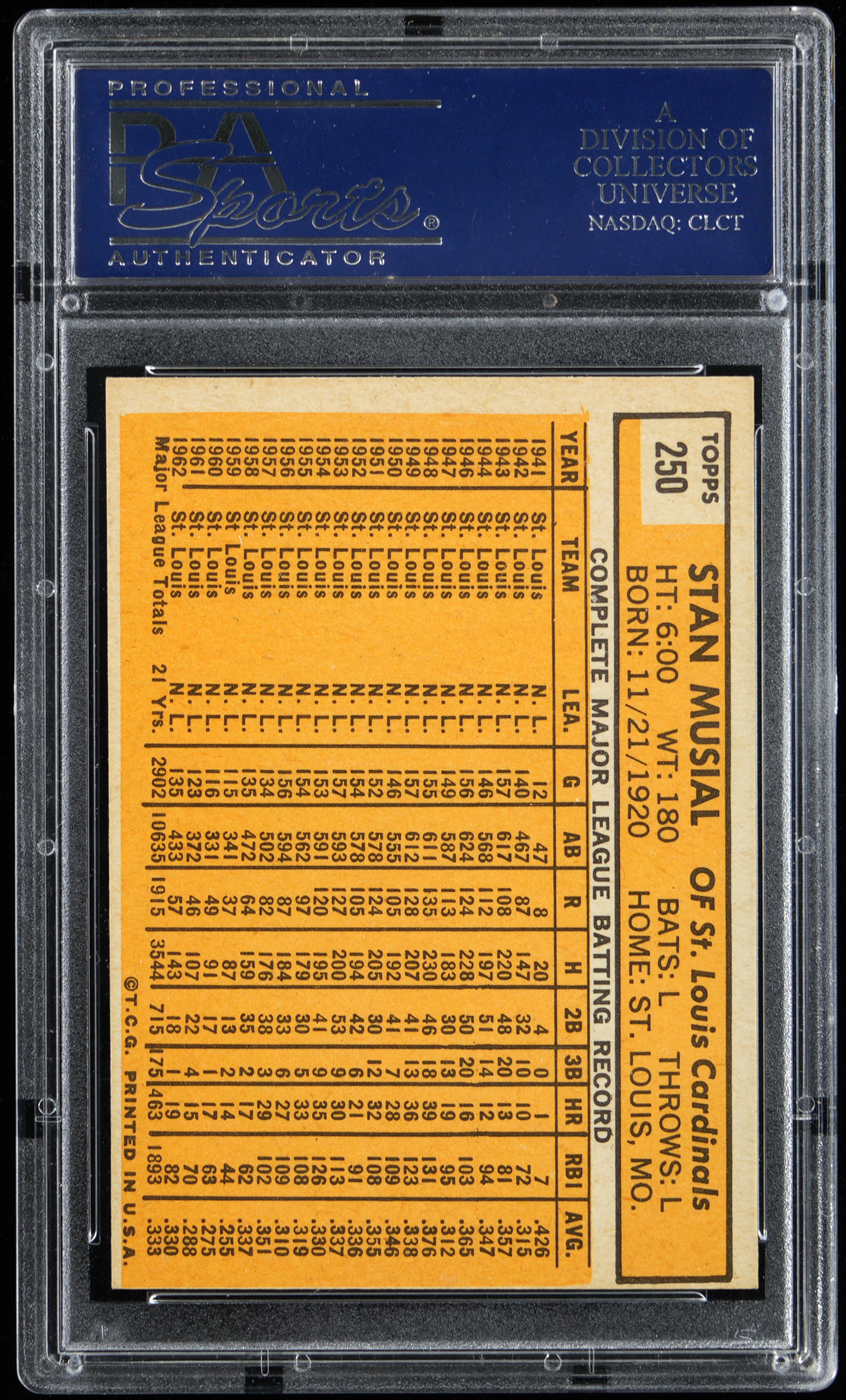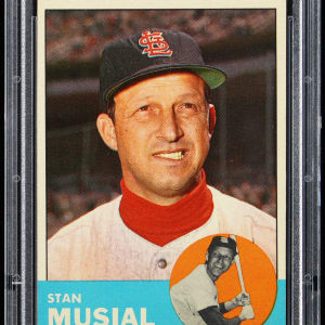 Graded NM-MT 8 by PSA. The final card of Stan Musial's illustrious career! This razor-sharp 1963 Topps #250 portrait of the St. Louis Cardinals Hall of Famer exhibits accurate centering, razor-sharp corners and unchipped bi-colored edges.