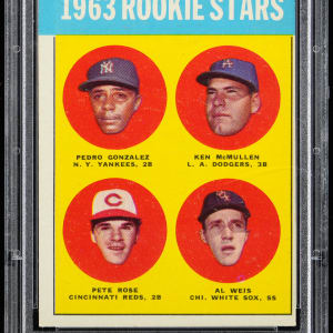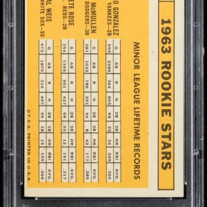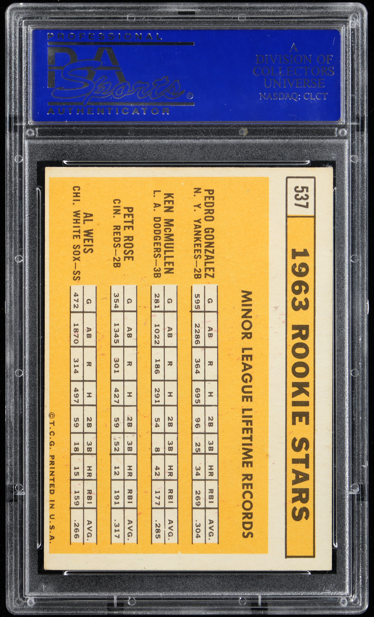 Graded EX 5 by PSA. Praiseworthy 1963 Topps #537 Pete Rose rookie card. This high number of the Cincinnati Reds all-time hit king is quite attractive with only limited corner wear (the brunt of which is found on the upper left corner). The "floating head" cameos are vibrant and the the "Minor League Lifetime Records" reverse is problem-free.