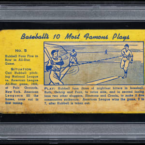 Graded VG 3 by PSA. Down goes Ruth, Gehrig, Foxx, Simmons and Cronin! New York Giants Hall of Fame hurler Carl Hubbell 1934 All-Star game heroics is documented on this circa 1939 D351 Grennan Bakery Baseball's 10 Most Famous Plays #8 Hall of Fame Type card. Entitled "Hubbell Fans Five in Row in All-Star Game," this recently discovered Pittsburgh-based treasure is printed on thick cardboard stock and measures overall 5 x 2-1/2" dimensions. Note: Huggins & Scott Auctions is proud to offer half of the known checklist of this enigmatic ACC designation. No examples have ever been graded by PSA or SGC and prior to the Summer 2025 find only a handful of examples have surfaced.