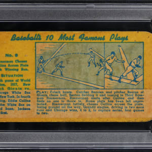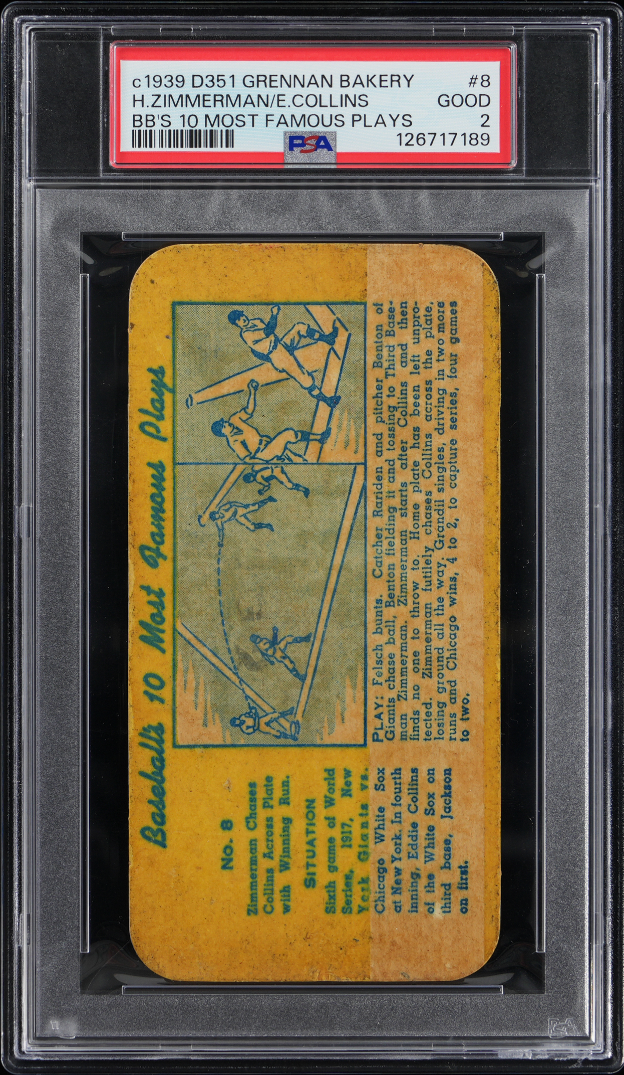 Pre-War Type Card! Graded GOOD 2 by PSA. Previously unknown and only graded example of the offered circa 1939 D351 Grennan Bakery Baseball's 10 Most Famous Plays #8 Heinie Zimmerman/Eddie Collins single. This recently discovered rarity hails from a Pittsburgh-based collection and is entitled "Zimmerman Chases Collins Around Plate with Winning Run." Measures nearly 5 x 2-1/2" and documents the pivotal moment from Game 6 of the 1917 World Series. Interestingly, Chicago White Sox legend "Shoeless" Joe Jackson is also mentioned in the text (surname only)! Note: Huggins & Scott Auctions is proud to offer half of the known checklist of this enigmatic ACC designation. No examples have ever been graded by PSA or SGC and prior to the Summer 2025 find only a handful of examples have surfaced.