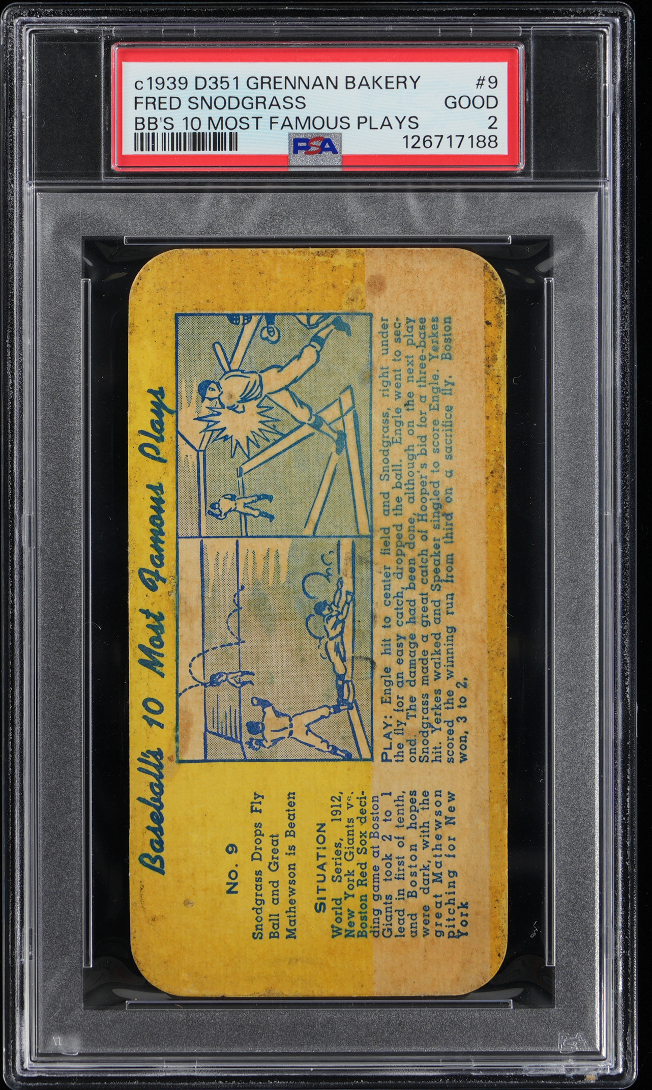 Graded GOOD 2 by PSA. New York Giants outfielder Fred Snodgrass is remembered for all of the wrong reasons on this circa 1939 D351 Grennan Bakery Baseball's 10 Most Famous Plays #9 sample. Entitled "Snodgrass Drops Fly and Great Mathewson is Beaten," this cardboard documentary details Snodgrass's "$30,000 Muff" in Game 8 of the 1912 World Series. The recently uncovered 5 x 2-1/2" cardboard slab presents admirably and arrives from a long stored away Pittsburgh-based collection. Note: Huggins & Scott Auctions is proud to offer half of the known checklist of this enigmatic ACC designation. No examples have ever been graded by PSA or SGC and prior to the Summer 2025 find only a handful of examples have surfaced.