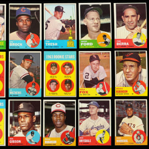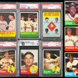Premier 1963 Topps near complete set of (570/576) cards with eight graded keys. This color splashed gallery has an approximate condition breakdown of 20% (NM or better), 35% (EX-MT), 30% (EX) and 15% (VG-EX or lesser) with the challenging high series generally presenting on level with the more available numbers. Highlights include: #1 Aaron/Musial/F. Robinson LL (EX-MT), #2 Mantle/Runnels LL (PSA NM 7), #3 Aaron/Banks/Mays LL (EX-MT), #18 Buc Blasters/Clemente (EX-MT), #25 Kaline (PSA EX-MT+ 6.5), #115 Yastrzemski (EX), #120 Maris (EX), #138 Mays/Musial (PSA NM 7), #173 Mantle/Richardson/Tresh (PSA EX 5), #228 Oliva RC (EX), #242 Aaron/Banks (NM), #247 Yankees Team (EX), #275 Mathews (EX-MT), #320 Spahn (PSA NM 7), #340 Berra (VG-EX), #345 B. Robinson (EX), #360 Drysdale (EX-MT), #380 Banks (VG-EX), #390 Aaron (EX), #400 F. Robinson (EX-MT), #412 Drysdale/Koufax/Podres (EX), #415 Gibson (EX-MT), #440 Marichal (EX), #446 Ford (EX-MT), #466 Freehan RC (NM), #470 Tresh (EX-MT), #472 Brock (EX), #473 Mets Team (PSA EX-MT 6), #490 McCovey (NM), #500 Killebrew (GAI NM-MT 8), #525 Fox (EX), #540 Clemente (PSA Altered), #544 Staub RC (EX-MT), #550 Snider (PSA EX-MT 6) and #552 Tigers Team (EX-MT). Also present are checklist variations for #102 (EX-MT) and #471 (marked) plus seven checklist duplicates (mostly marked) while the corresponding checklists in the set are unmarked. Missing only #200 Mantle, #210 Koufax, #250 Musial, #300 Mays, #537 Rose RC and #553 Stargell RC (available as separate lots throughout this auction) for completion.