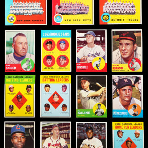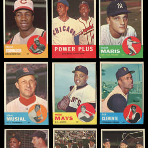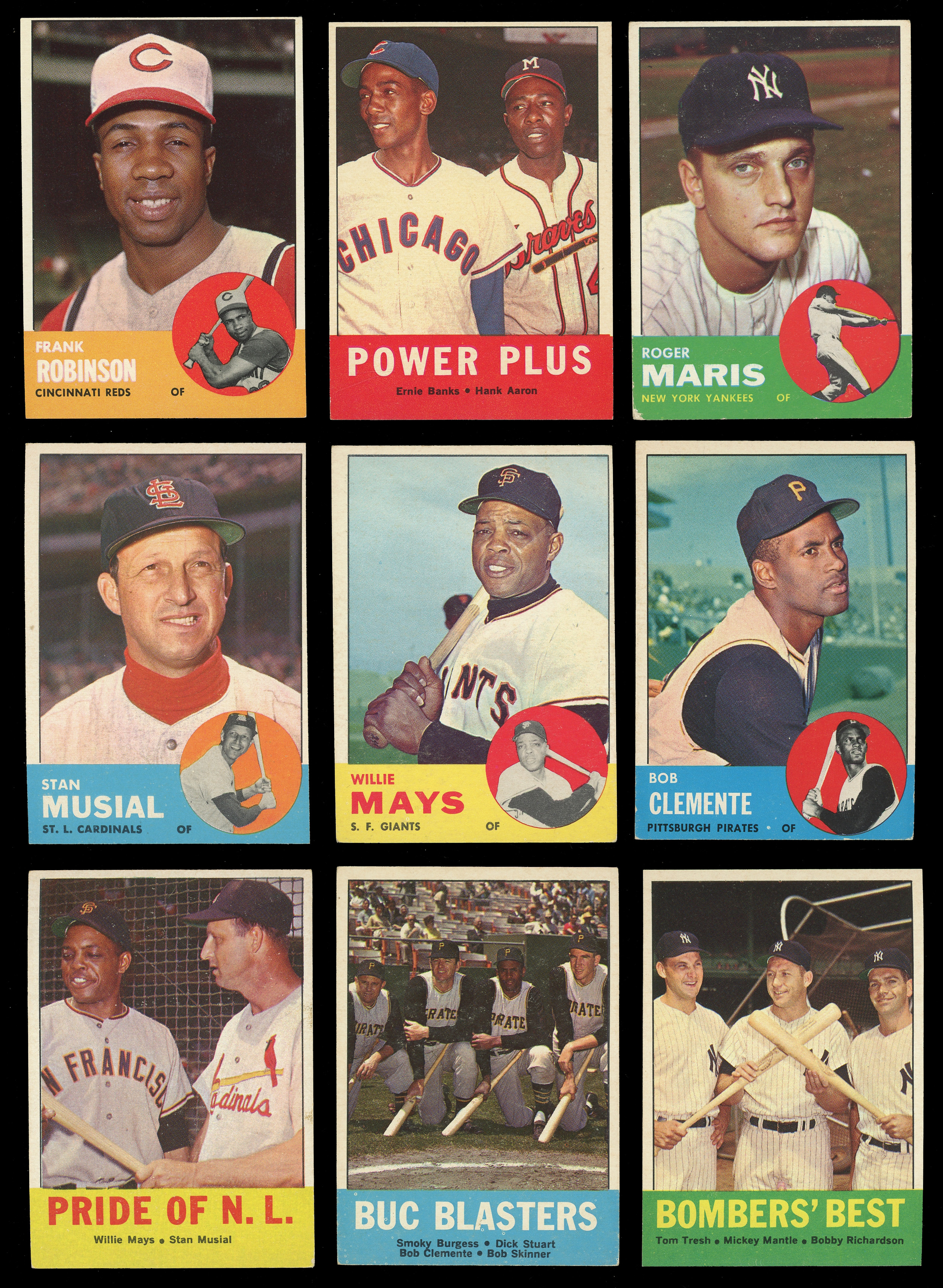 Swell 1963 Topps near complete set of (546/576) cards with several key Hall of Famers and stars. This color splashed gallery has an overall approximate condition breakdown of 20% (EX-MT or better), 35% (EX), 25% (VG-EX) and 20% (VG or lesser) with the tougher high series generally presenting on level with the more available numbers. Highlights include: #1 Aaron/Musial/F. Robinson LL (EX-MT), #2 Mantle/Runnels LL (EX), #3 Aaron/Banks/Mays LL (EX), #18 Buc Blasters/Clemente (VG-EX), #25 Kaline (VG), #115 Yastrzemski (VG), #120 Maris (VG), #138 Mays/Musial (VG-EX), #173 Mantle/Richardson/Tresh (EX-MT), #242 Aaron/Banks (VG), #247 Yankees Team (VG), #250 Musial (EX), #300 Mays (VG), #320 Spahn (EX), #345 B. Robinson (VG-EX), #360 Drysdale (EX), #400 F. Robinson (VG), #440 Marichal (VG-EX), #470 Tresh (EX), #472 Brock (EX-MT), #473 Mets Team (VG-EX), #500 Killebrew (VG-EX), #540 Clemente (EX), #544 Staub RC (EX), #550 Snider (EX) and #552 Tigers Team (EX-MT).