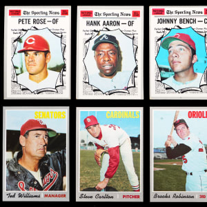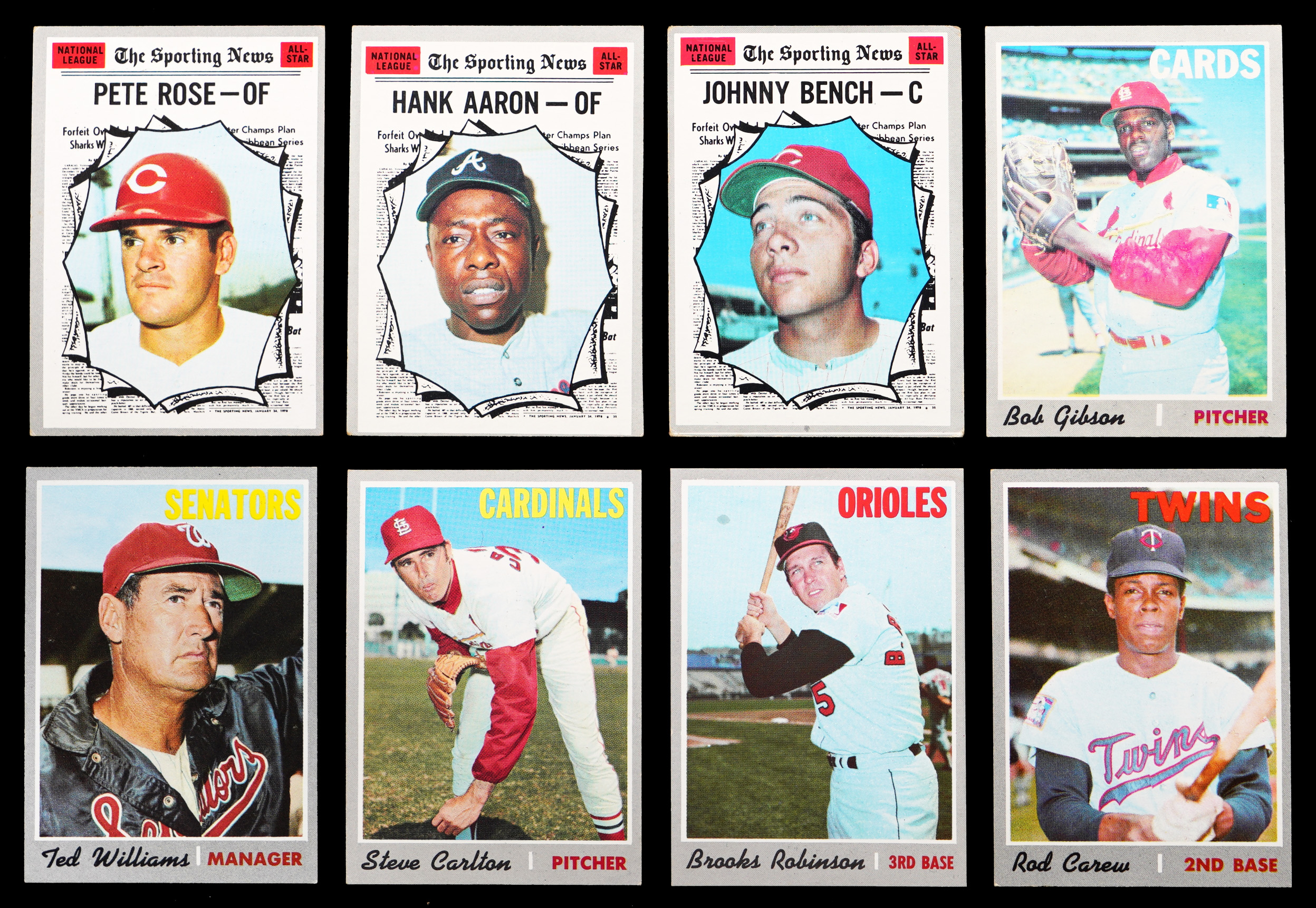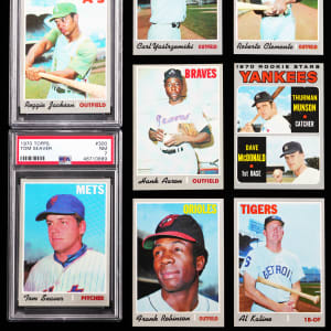 Similar to the Baltimore Orioles in the 1970 World Series, emerge victorious with the offered 1970 Topps near complete set of (713/720) cards. These crisp silver borders have an approximate condition breakdown of 20% (NM or better), 40% (EX-MT), 25% (EX) and 15% (VG-EX or lesser) with the tougher high series generally presenting on level with the more available numbers. Highlights include: #1 Mets Team (EX-MT), #10 Yastrzemski (EX-MT), #140 R. Jackson (PSA NM 7), #189 Munson RC (VG), #197 Ryan Playoffs (EX-MT), #198 Mets Celebrate/Ryan (NM), #211 T. Williams (EX-MT), #220 Carlton (EX-MT), #230 B. Robinson (EX-MT), #290 Carew (EX-MT), #300 Seaver (PSA NM 7), #350 Clemente (EX-MT), #458 Rose AS (VG-EX), #462 Aaron AS (VG), #464 Bench AS (VG), #500 Aaron (VG), #530 Gibson (VG), #640 Kaline (EX-MT), #700 F. Robinson (EX-MT) and #713 Pilots Team (EX). Missing only #580 Rose, #600 Mays, #630 Banks, 654, #660 Bench, 683 and #712 Ryan for completion.