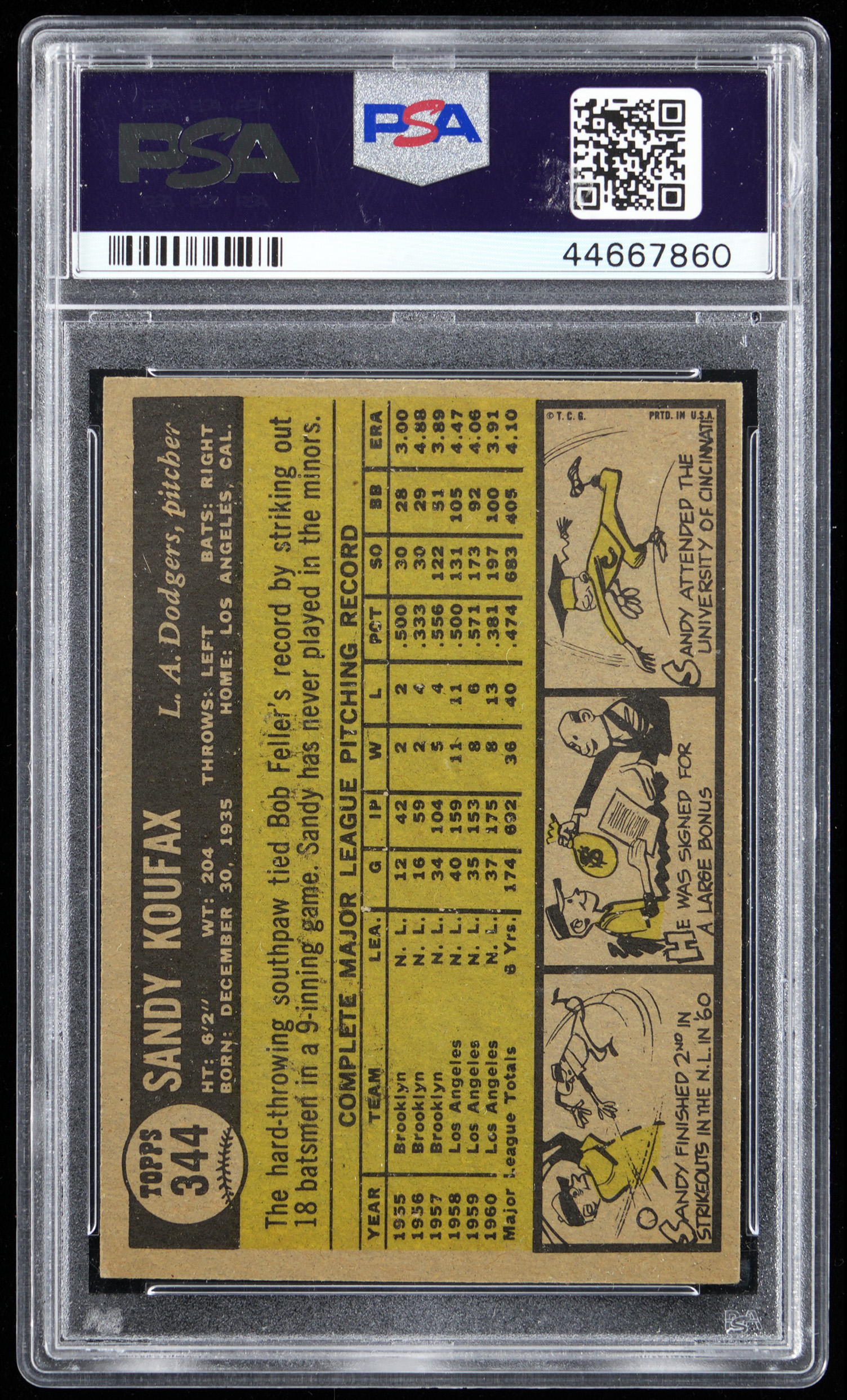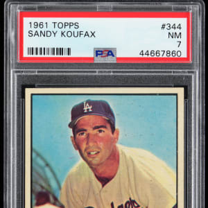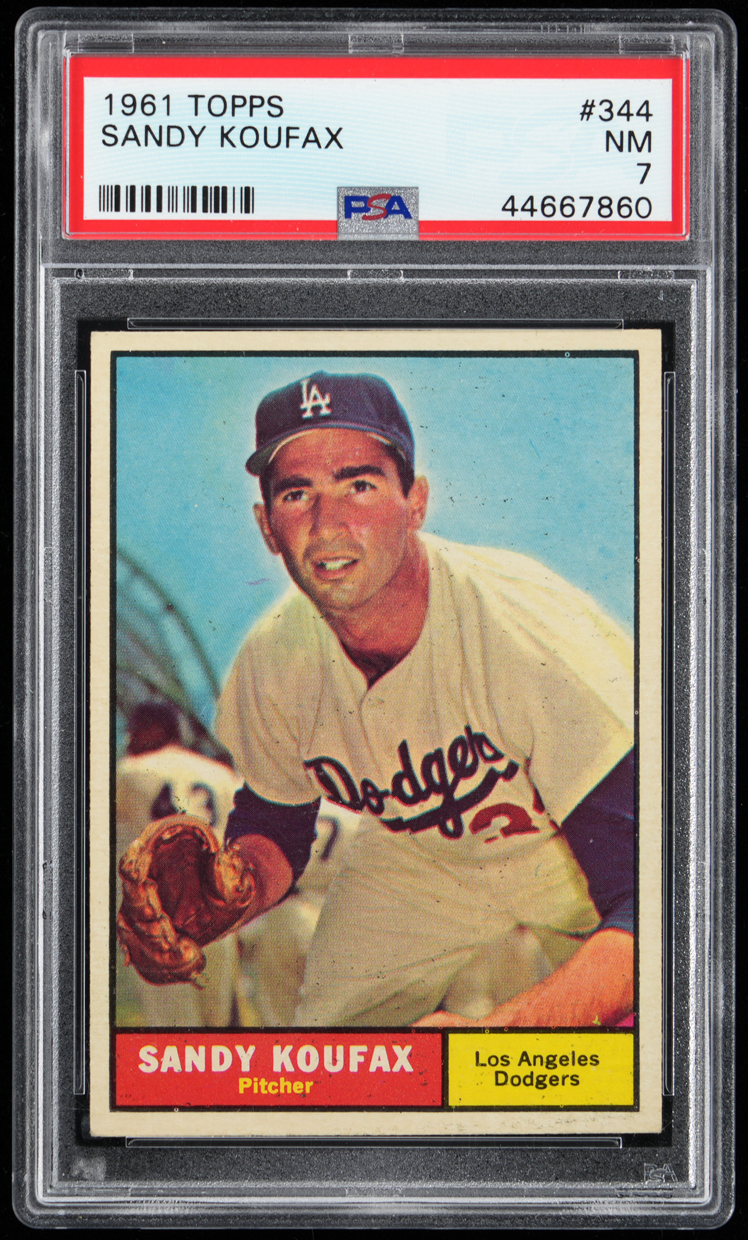 Graded NM 7 by PSA. From the season in which Sandy Koufax earned his first National League All-Star nod arrives the offered 1961 Topps #344 single. Los Angeles Dodgers Hall of Famer.