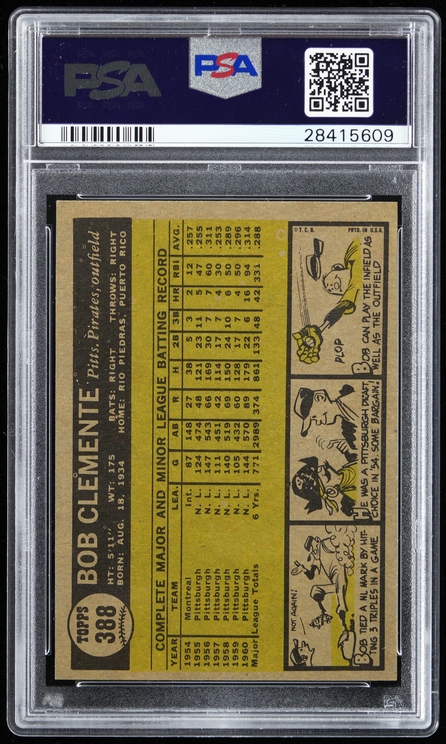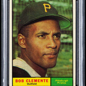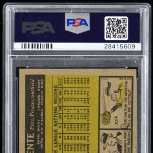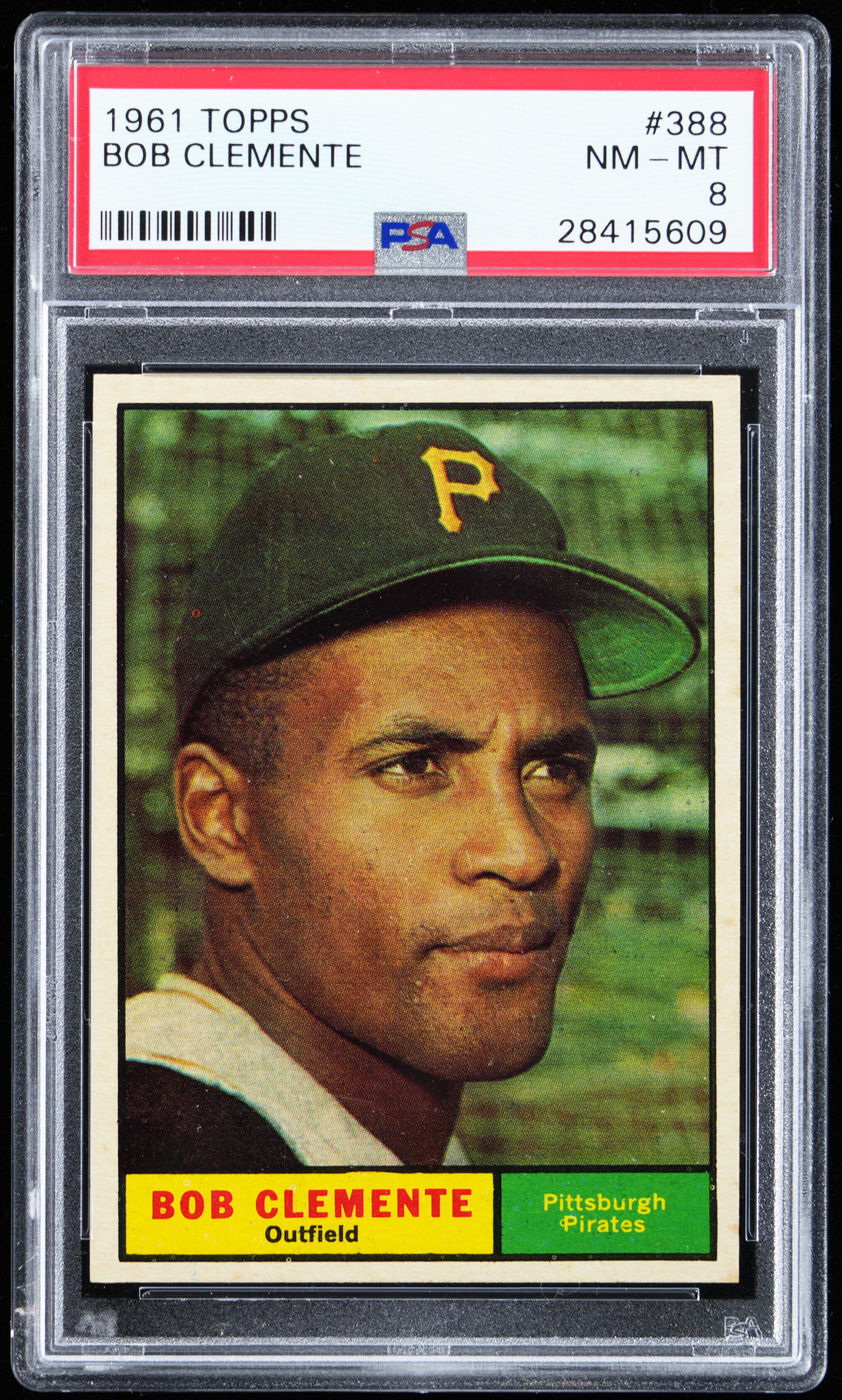 Graded NM-MT 8 by PSA. Sterling 1961 Topps #388 Roberto Clemente single. This swashbuckling Pittsburgh Pirates Hall of Famer is framed by four sharp corners, off-white edges, brilliant surface colors and a clean back. Perfect for those PSA Registry specialists piecing together a high-grade '61 set.