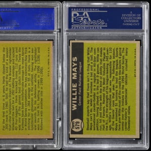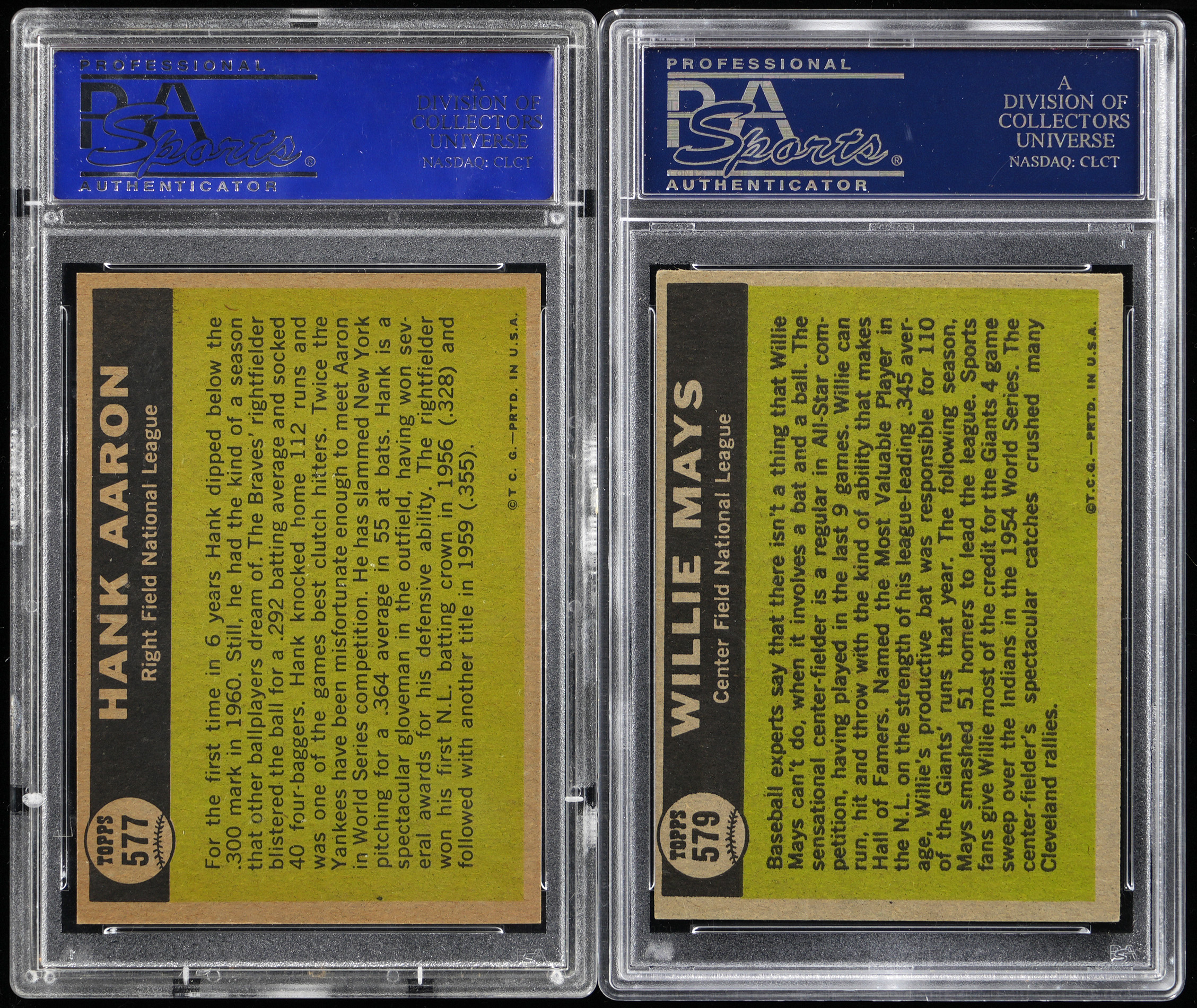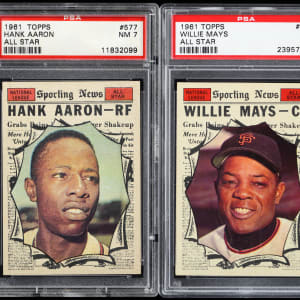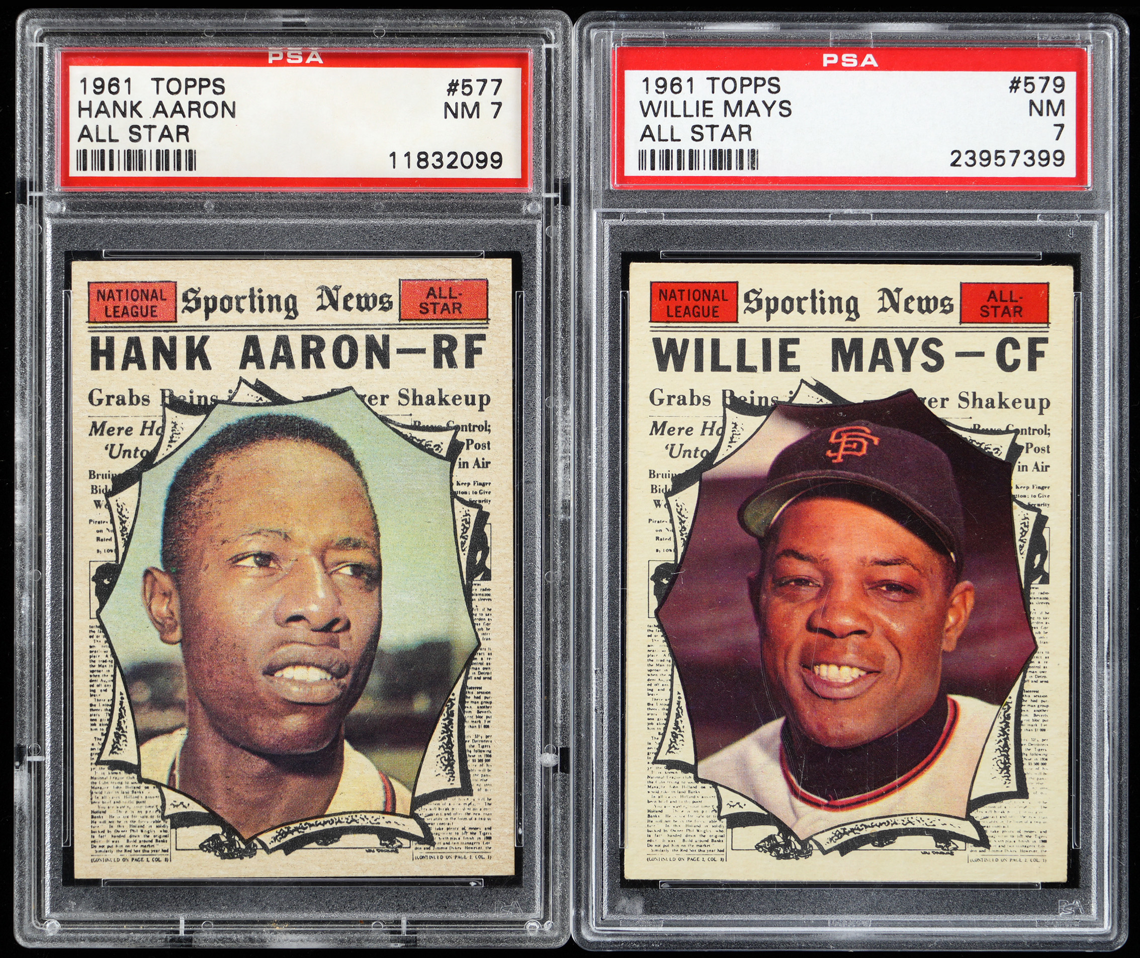 Each graded NM 7 by PSA. National League Hall of Famers power the offered pair of 1961 Topps All-Star high numbers. Includes: 1.) #577 Aaron AS and 2.) #579 Mays AS.