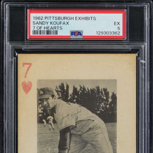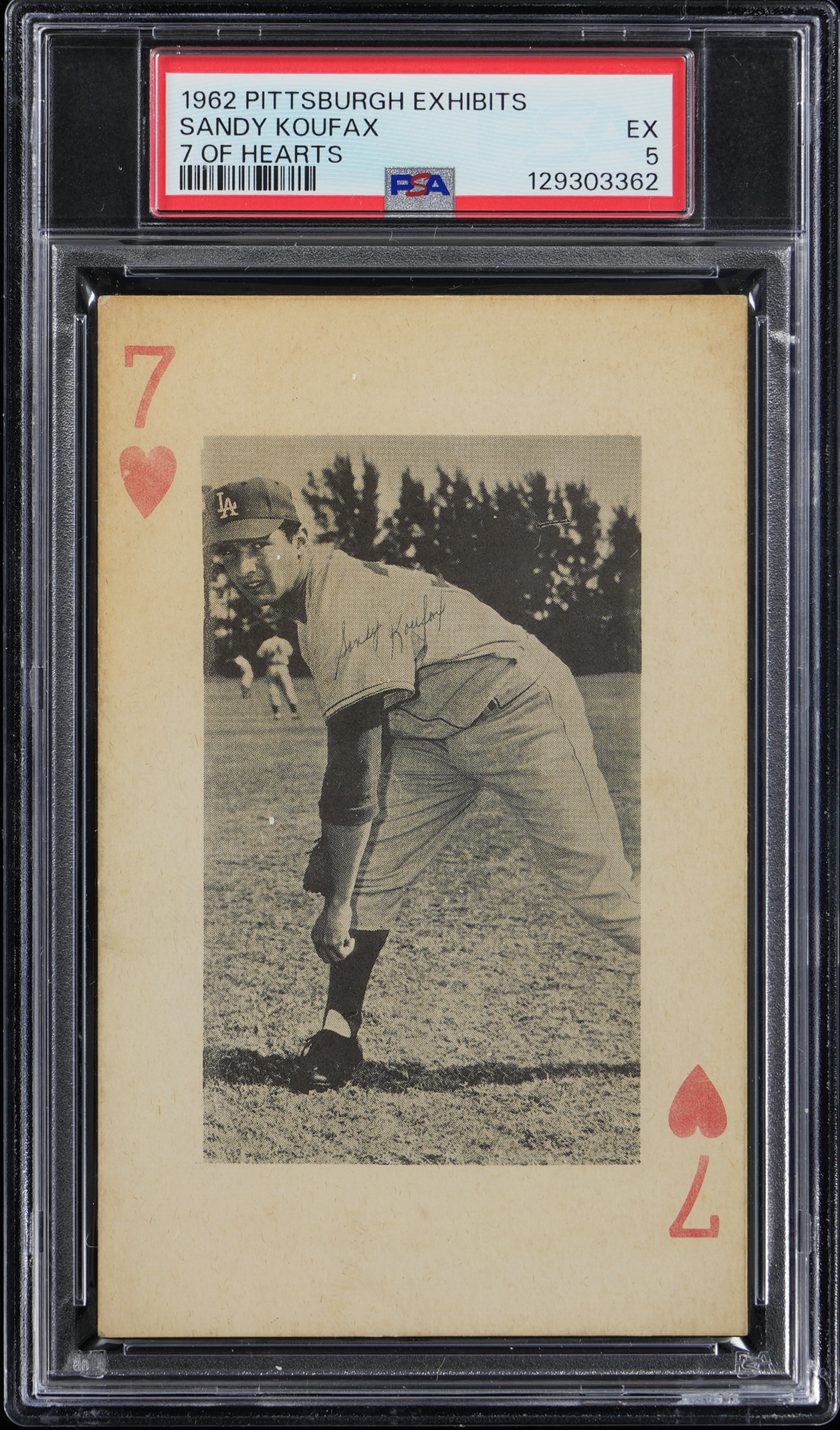 Graded EX 5 by PSA. The offered 1962 Pittsburgh Exhibits Sandy Koufax is the ultimate period Type card of the Los Angeles Dodgers Hall of Fame pitcher. This 7 of Hearts action pose was purportedly only distributed at Kennywood Amusement Park in West Mifflin, Pennsylvania during the summer of '62. Of the 12 total graded Koufax examples judged by the grading service, this stylish playing card themed example survives as 1 of 6 at the grading level with only 2 higher. What sets this already elusive card apart from the handful of other reported Koufax singles made available for public sale is that this piece contains black promotional text referencing prizes on the otherwise blank reverse. All other Koufax sales have been blank backed. With legions of die-hard Koufax fans throughout the hobby, this first offered 1960s rarity will certainly attract significant bidding interest!