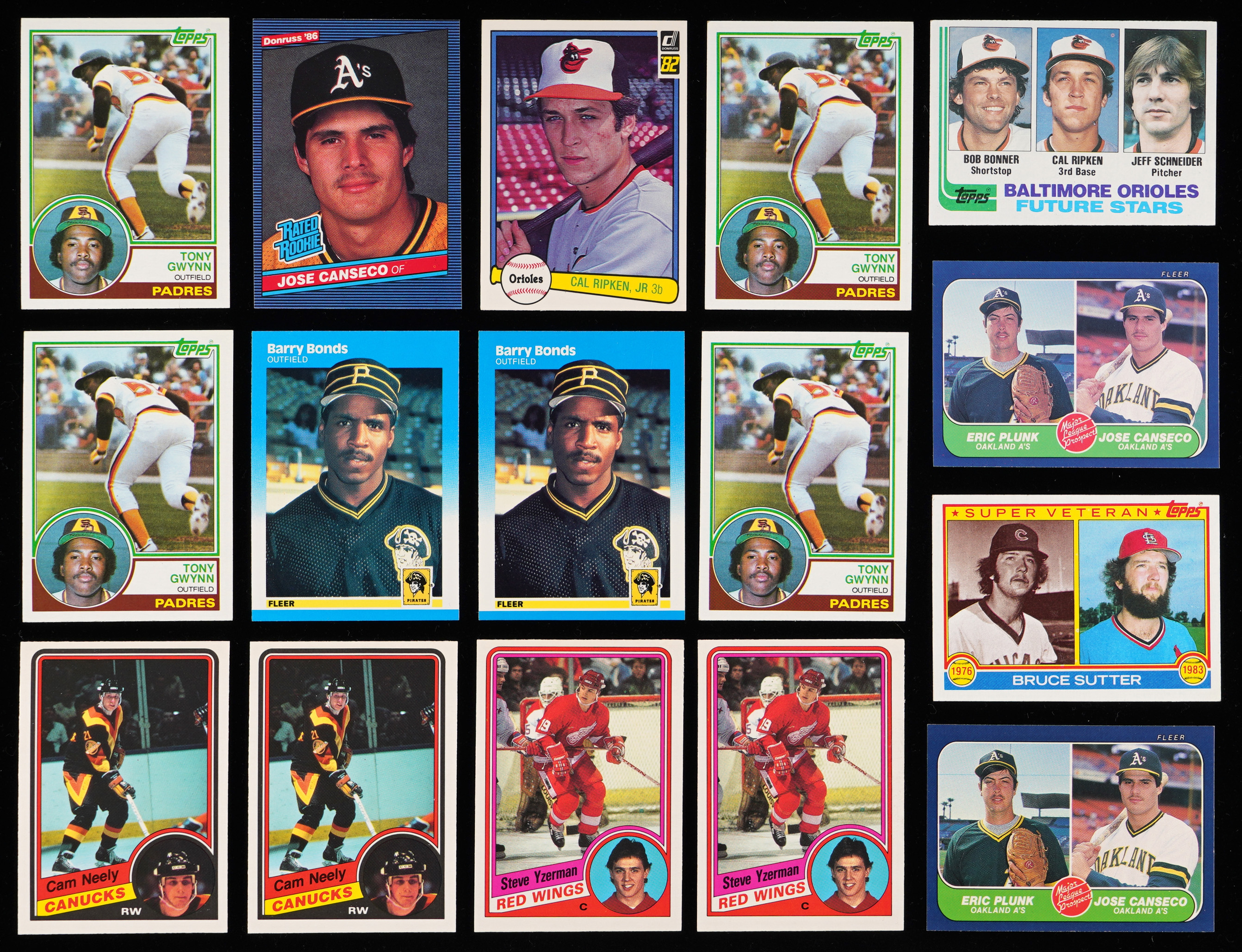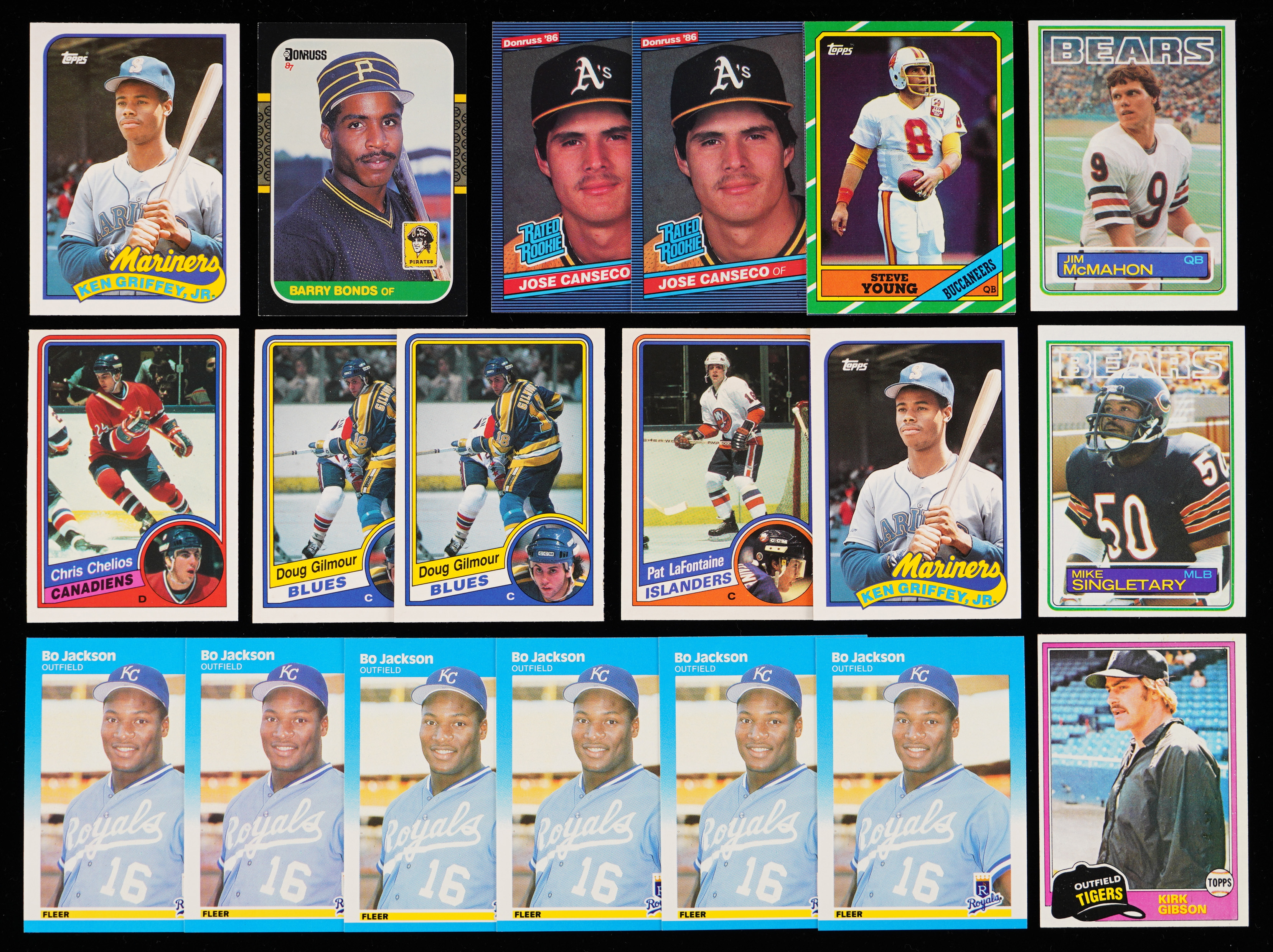 Baseball: (400+ cards) with 1981 Topps #315 K. Gibson RC (EX-MT), 1982 Donruss #405 Ripken Jr. RC, 1982 Topps #21 Ripken RC, (4) 1983 Topps #482 Gwynn RC, (4) 1986 Donruss #39 Canseco RC, (2) 1986 Fleer #649 Canseco RC, 1987 Donruss #361 Bonds RC, 1987 Fleer: (13) #67 Ryan, (6) #369 B. Jackson RC, (2) #604 Bonds RC; 1987 Topps #320 Bonds RC, (2) 1989 Topps Traded #41T Griffey Jr. RC;