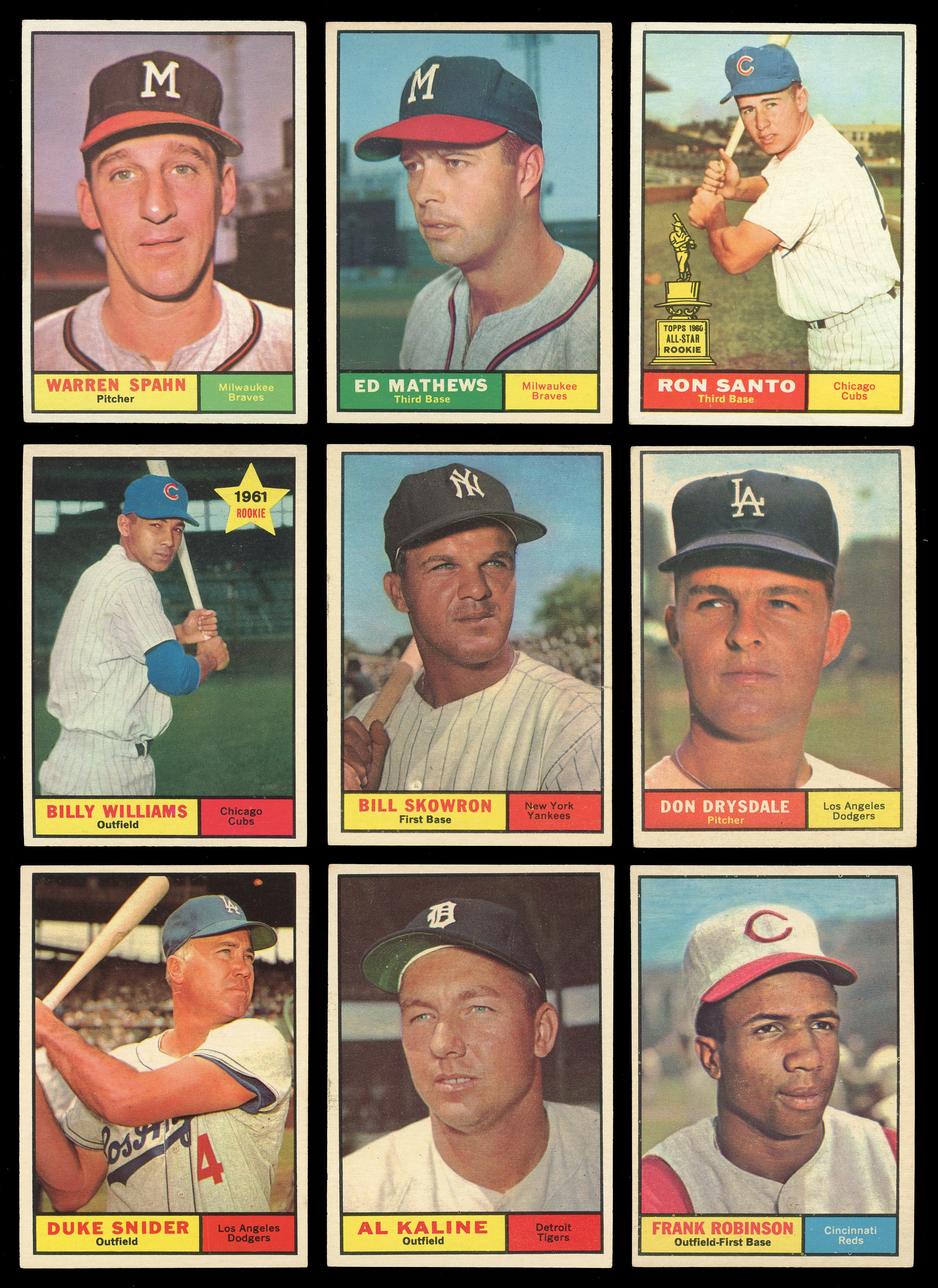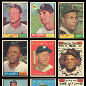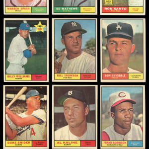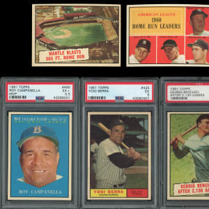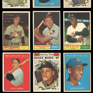 Premium 1961 Topps near complete set of (559/587) cards with several Hall of Famers and three PSA graded keys. This classic selection has an approximate condition breakdown of 30% (EX-MT or better), 30% (EX), 20% (VG-EX) and 20% (VG or lesser) with the tougher high series generally presenting on level with the more available numbers. Highlights include: #1 Groat (VG-EX), #10 B. Robinson (EX), #35 Santo RC (EX), #41 Mays/Clemente LL (EX), #44 Mantle/Maris LL (EX), #120 Mathews (EX-MT), #141 B. Williams RC (EX-MT), #150 Mays (EX-MT), #200 Spahn (VG-EX), #228 Yankees Team (VG-EX), #260 Drysdale (VG-EX), #287 Yastrzemski (VG-EX), #290 Musial (VG-EX), #344 Koufax (EX), #360 F. Robinson (EX), #371 Skowron (VG-EX), #388 Clemente (VG), #405 Gehrig Streak (PSA EX-MT 6), #406 Mantle HR (EX), #425 Berra (PSA EX 5), #429 Kaline (EX), #430 Mazeroski (EX-MT), #443 Snider (EX), #472 Berra MVP (EX), #475 Mantle MVP (EX), #480 Campanella MVP (PSA EX+ 5.5), #482 Mays MVP (GD), #484 Aaron MVP (EX-MT), #485 Banks MVP (EX-MT), #517 McCovey (EX-MT), #542 Twins Team (EX), #545 Wilhelm (EX), #554 Pirates Team (EX-MT), #571 Mazeroski AS (EX-MT), #575 Banks AS (VG), #576 Maris AS (EX), #577 Aaron AS (EX-MT) and #579 Mays AS (VG-EX).