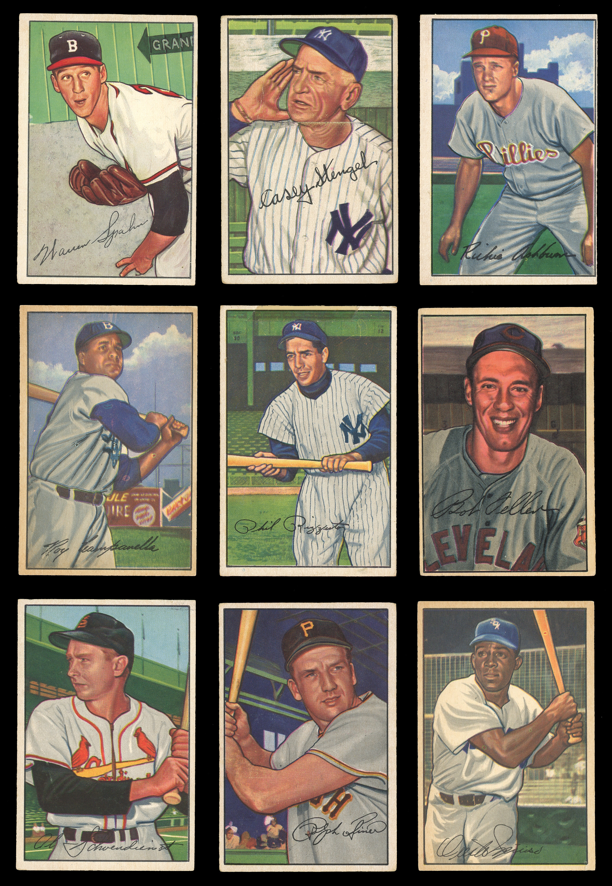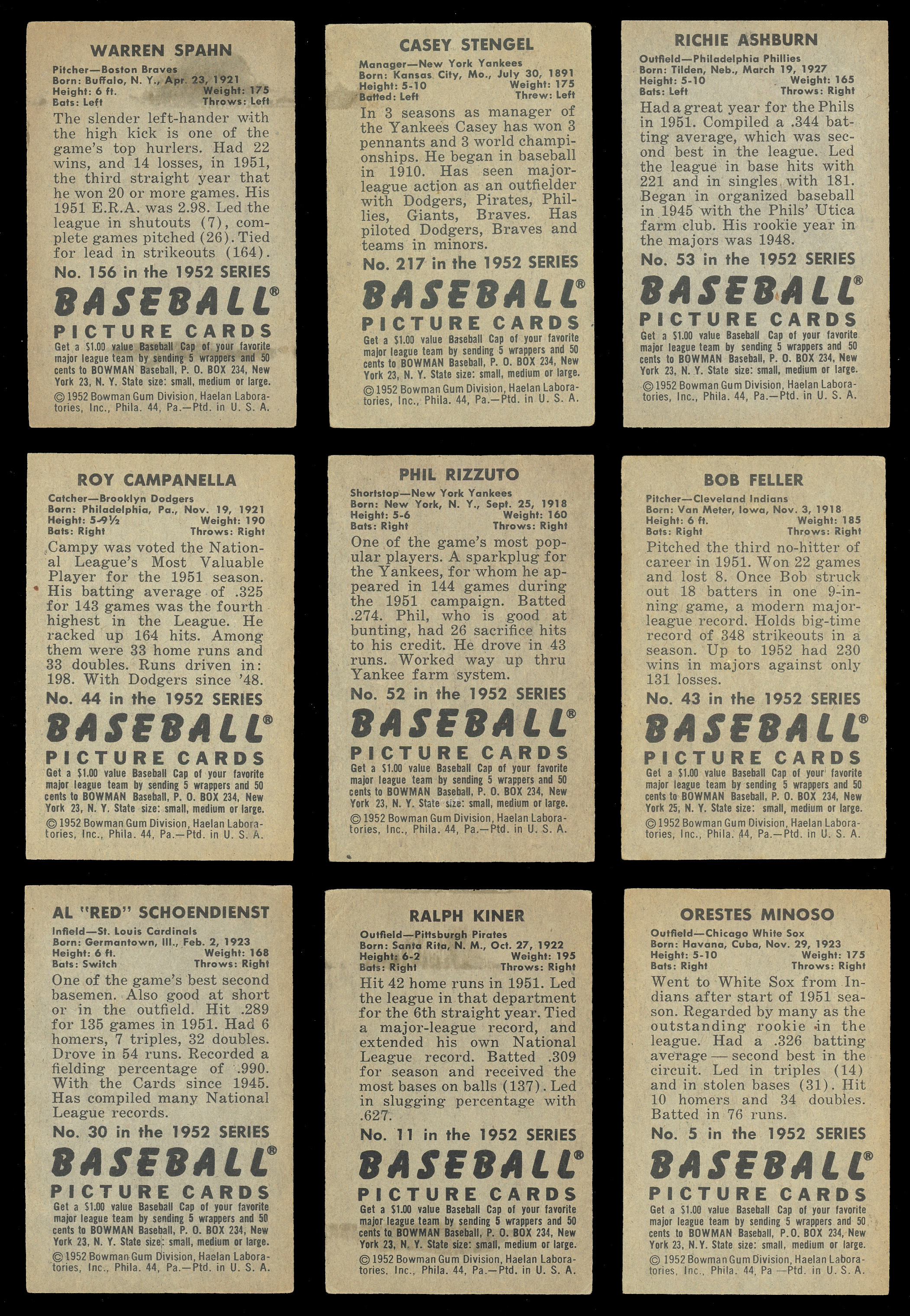 Clinch the winning bid for the offered 1952 Bowman partial set of (135/252) cards with (10) Hall of Famers and (13) tougher high numbers (average VG). This "collector's grade" assembly generally presents in the (VG-EX to EX) range with some better or lesser. Highlights include: #5 Minoso RC (EX), #11 Kiner (VG), #30 Schoendienst (VG-EX), #43 Feller (VG), #44 Campanella (EX), #52 Rizzuto (FR, tape), #53 Ashburn (VG), #156 Spahn (VG-EX), #158 B. Harris (FR, tape) and #217 Stengel (GD).