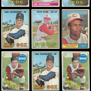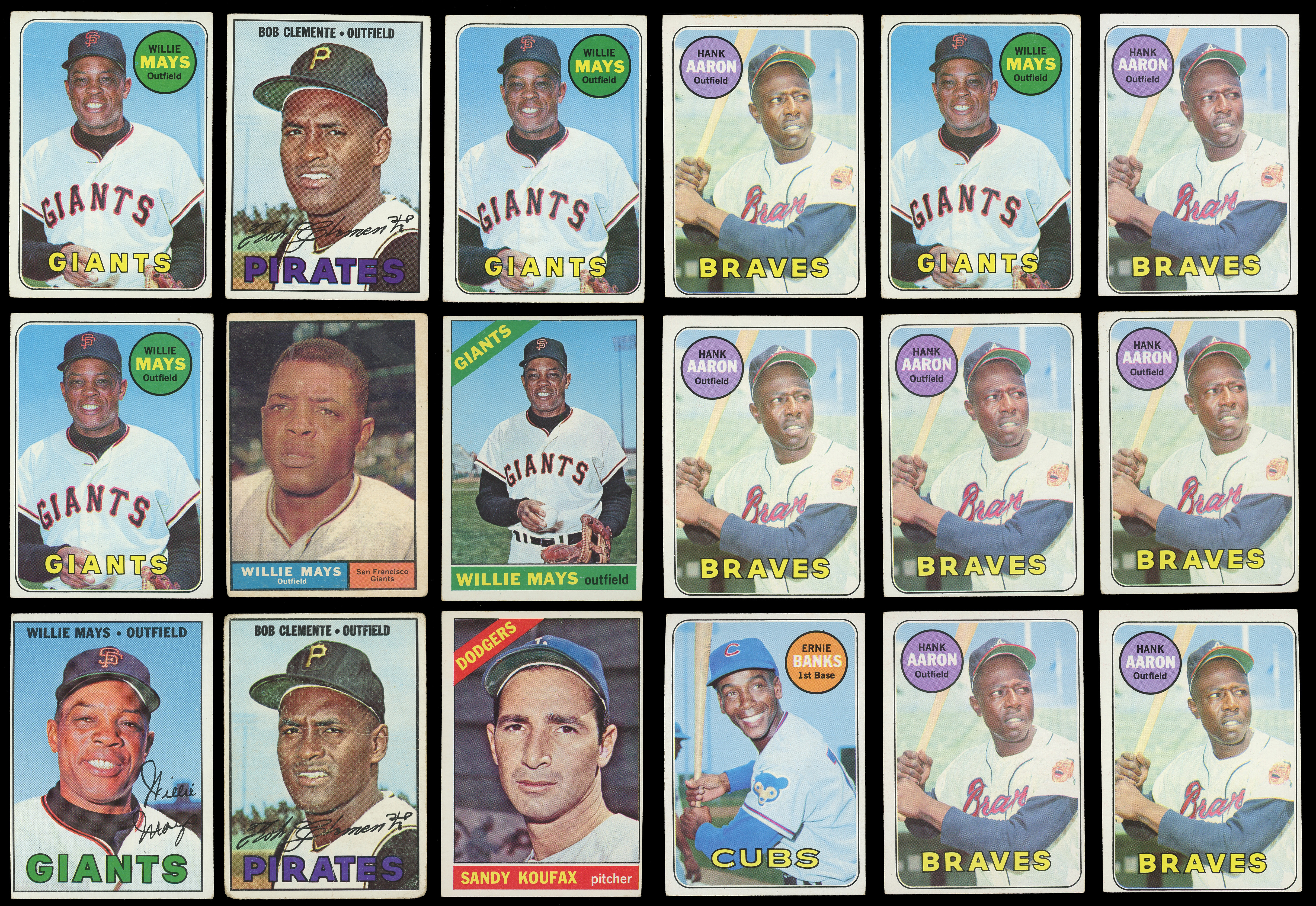 1969 Topps: (55 stars, average VG-EX) with #20 Banks (VG-EX), (2) #95 Bench (both VG), (4) #99 Nettles RC (average VG, No Loop), (7) #100 Aaron (average VG), (2) #120 Rose (EX, VG), (4) #130 Yastrzemski (average VG), (4) #190 Mays (average VG), #200 Gibson (VG), (2) #250 F. Robinson (VG, FR), (3) #255 Carlton ((2) EX, VG-EX), #375 Killebrew (EX), #400 Drysdale (EX-MT), (4) #424 Rose AS (average EX), (5) #425 Yastrzemski AS (average VG-EX), (3) #550 B. Robinson ((2) EX, VG), (4) #573 Palmer (average VG-EX)
