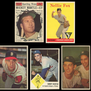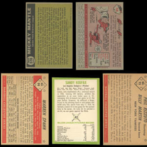 Each submitted to PSA and returned as either "evidence of trimming" or "minimum size requirements not met." Original group of (5) 1953-1961 Topps, Bowman and Fleer Hall of Famers. With exception to any modifications, the fronts are crease-free with vibrant surface colors and clean backs. Includes: 1953 Bowman Color: (2 cards) with #93 Rizzuto/B. Martin, #99 Spahn; 1958 Topps: #400 Fox; 1961 Topps: #578 Mantle AS and 1963 Fleer: #42 Koufax.