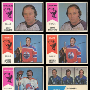 1975-1976 O-Pee-Chee WHA near: (65/66, average EX-MT, missing #5, plus 6 dupes) with #1 The Howes (EX), (2) #30 Cheevers (NM, EX-MT), (2) #50 Bo. Hull (EX, VG-EX), #53 CL (EX-MT), (2) #64 Plante (both EX-MT);