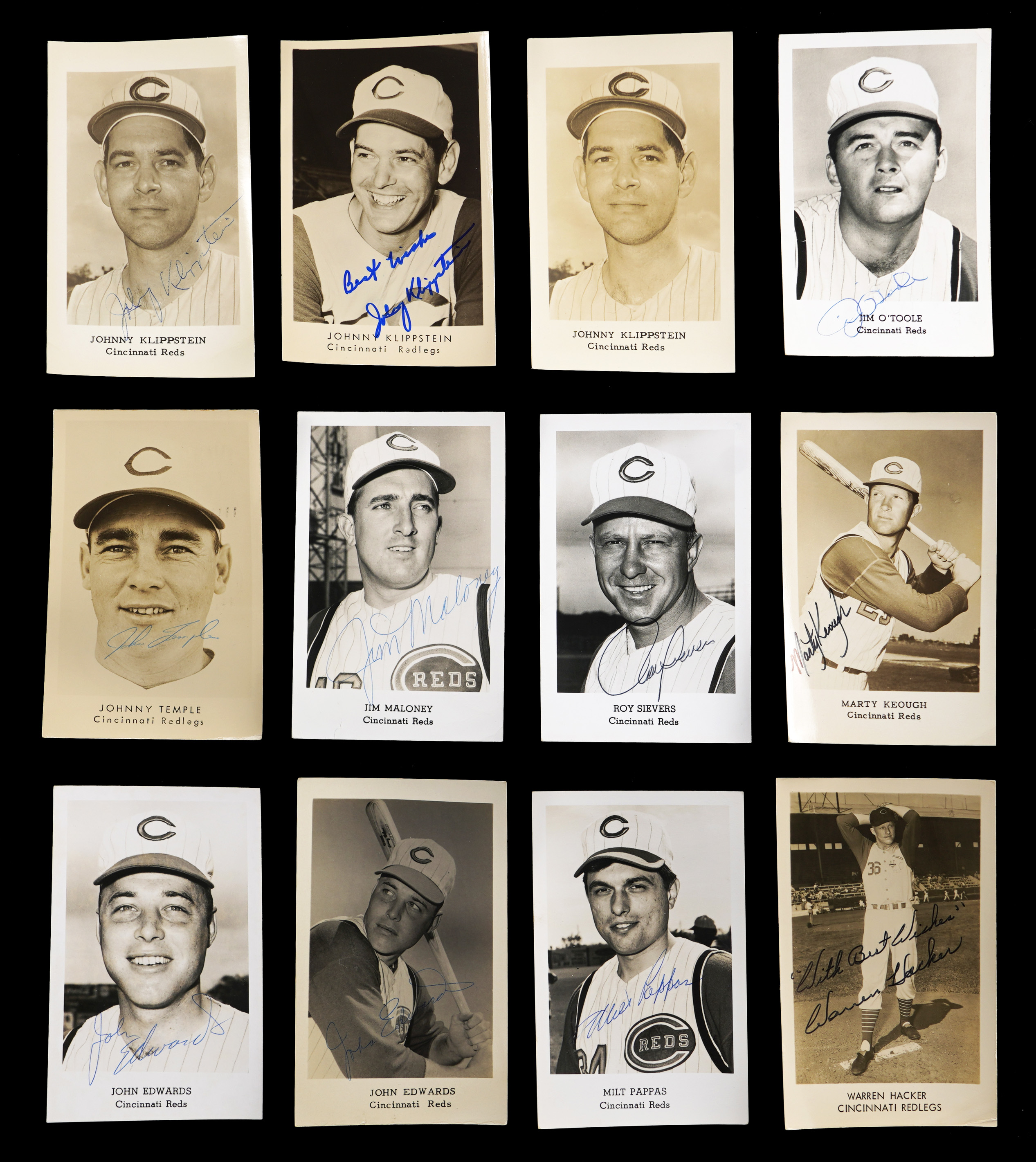 Signed 1950s-1970s Cincinnati Reds: (26 cards, average “7-8” on mostly EX surfaces with 31% reverse writing, Auction LOA from James Spence/JSA) with Adams, Bailey, Batts, Crowley, (2) Edwards, Fondy, Hacker, Haddix, (2) House, Kasko, Keough, (3) Klippstein (one signed on back), Maloney, Nolan, O’Toole, Pappas, Post, Seminick, (2) Sievers, (2) Temple;