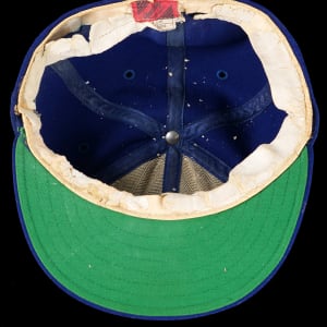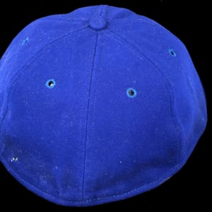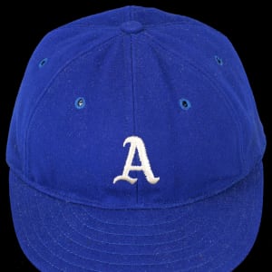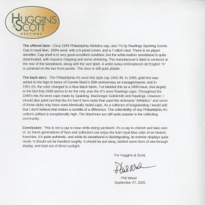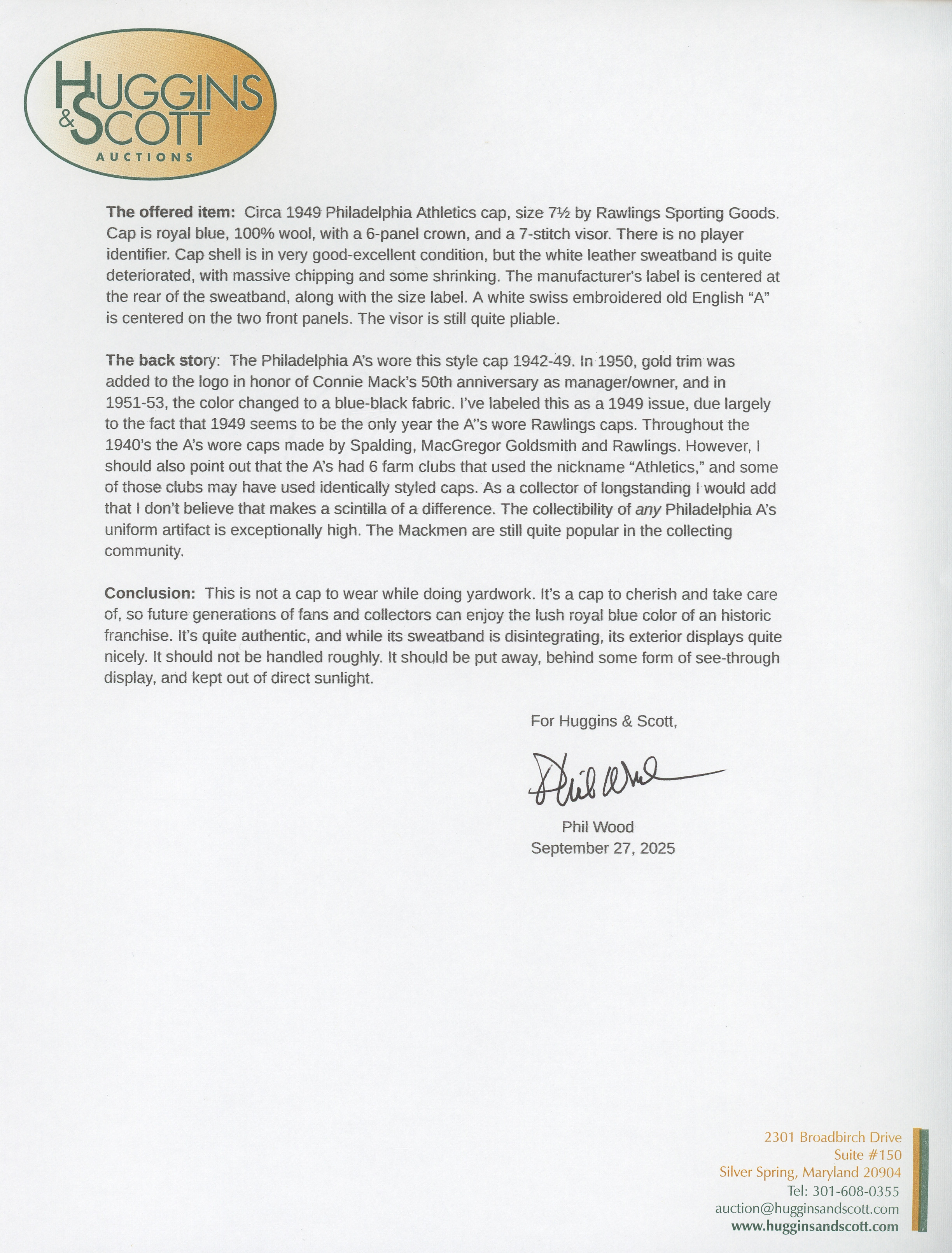 This circa 1949 Philadelphia Athletics cap, size 7 ½ by Rawlings, is royal blue, 100% wool, with no player identifier. Cap shell is in Good to Excellent condition, but the white leather sweatband is quite deteriorated. Embroidered Old English “A” is centered on the two front panels. The visor is still quite pliable. The Philadelphia A's wore this style cap 1942-49. The collectability of any Philadelphia A's uniform artifact is exceptionally high, and this style in particular. Comes with Full LOA from Phil Wood.