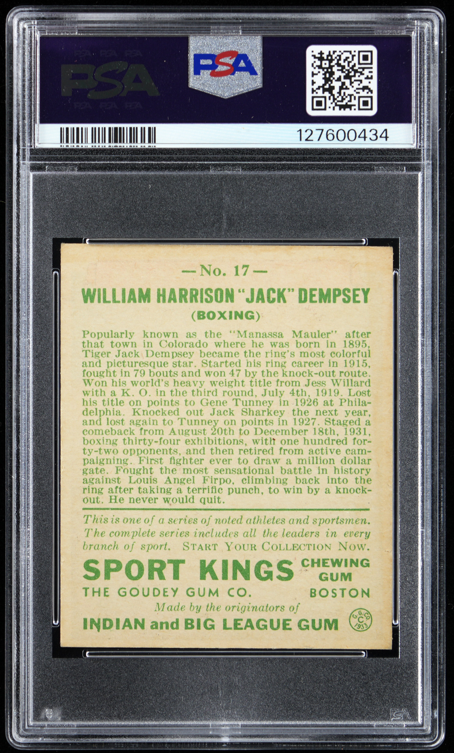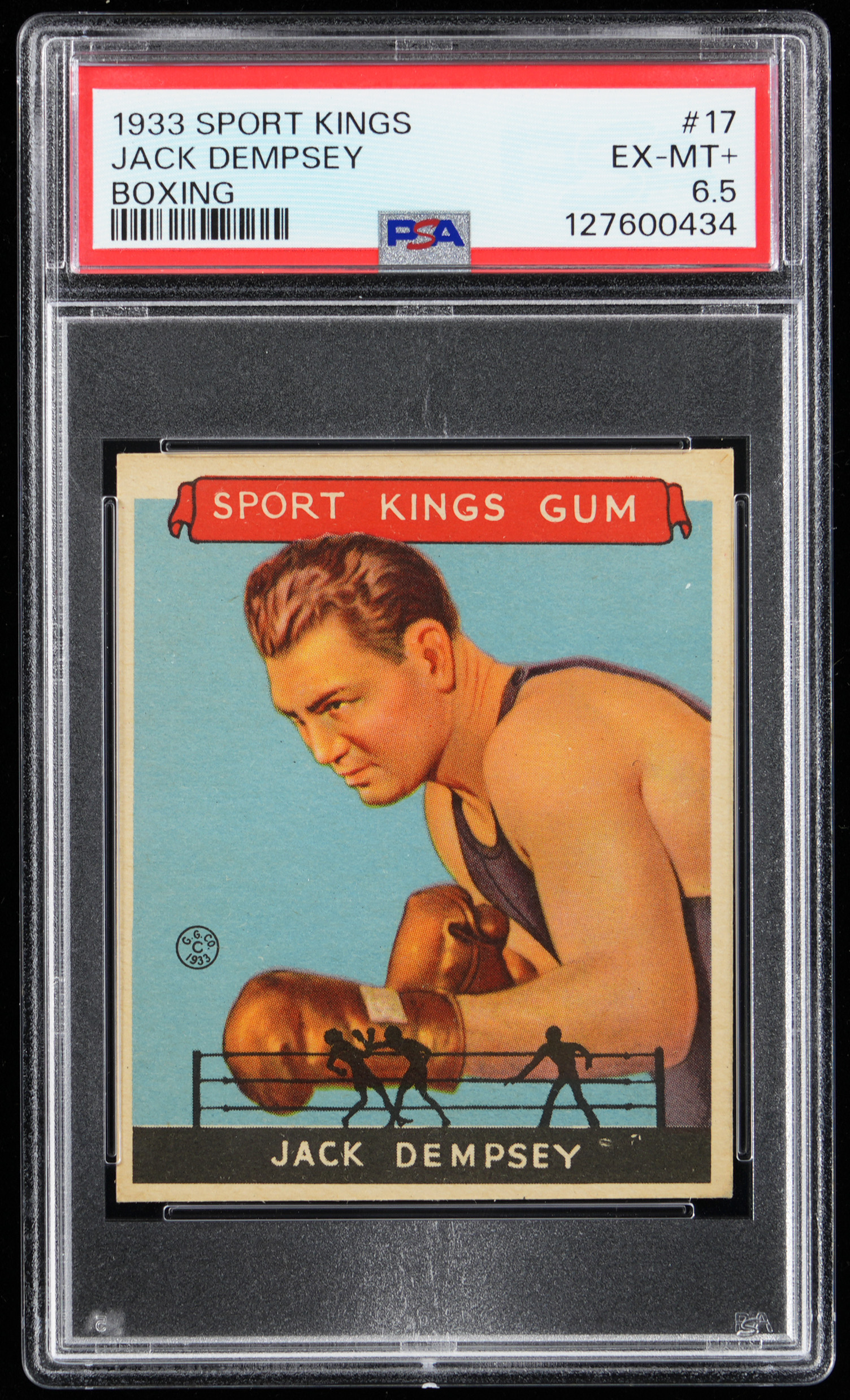 The Manassa Mauler! Graded EX-MT+ 6.5 by PSA. Former World Heavyweight Champion Jack Dempsey surveys an ill-fated contender on this sharp 1933 Sport Kings Gum #17 example. This hard-hitting blockbuster is framed by four sharp corners, creamy edges and spellbinding surface colors. The green text reverse which goes into depth regarding Dempsey's storied career is clean. A prime 92-year-old centerpiece that is equal to one champ's devastating punches!