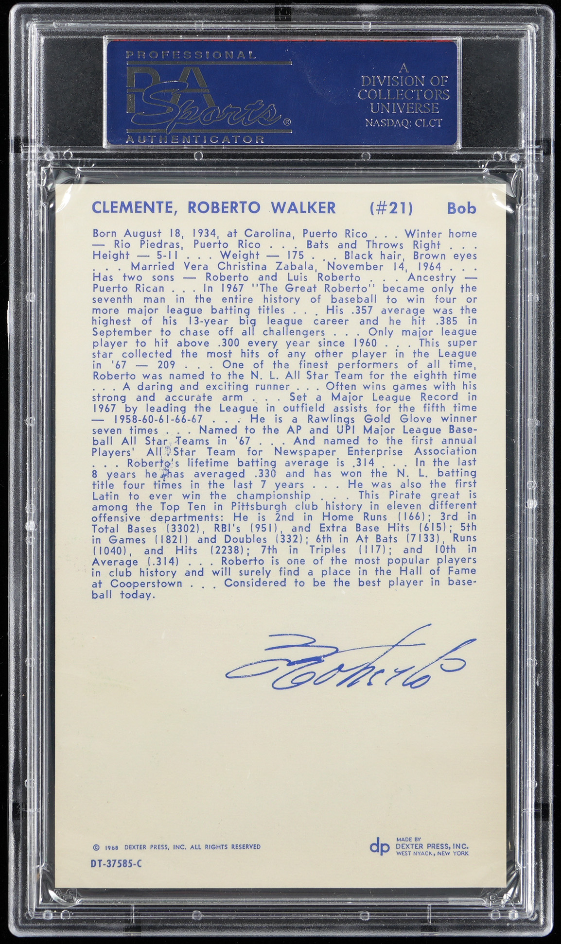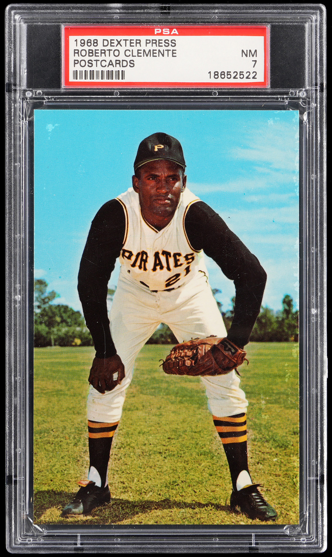 Graded NM 7 by PSA. Full-color 1968 Dexter Press Postcard picturing Pittsburgh Pirates Hall of Famer Roberto Clemente.